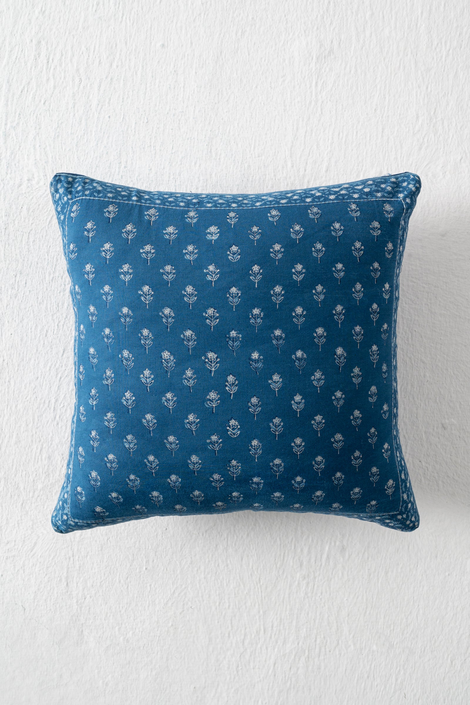 Experience the perfect blend of tradition and modernity with our Manjishta Small Buti Cushion. Handcrafted from indigo cotton and adorned with a dabu hand block print, this cushion cover features a beautiful flower print and delicate kantha work. Enhance your living space with this unique and elegant piece.