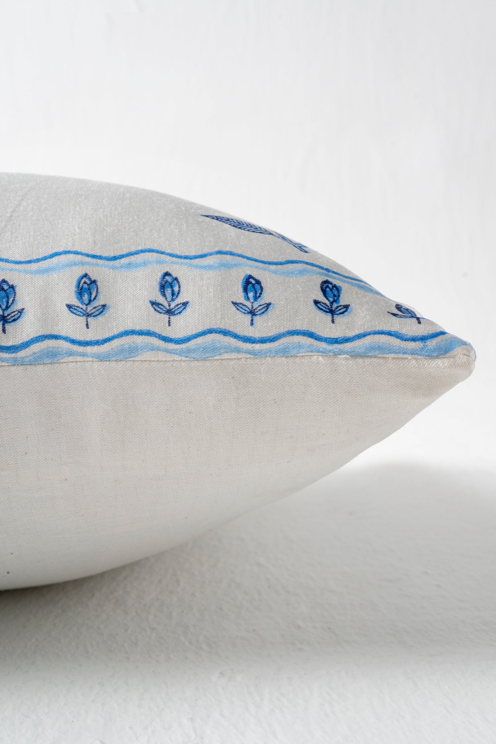This MOGRA CUSHION features a white mashru silk cover with a hand block printed pigment design of flowers. Soft and luxurious, this cushion adds a touch of elegance to any room while providing comfortable support for lounging or resting. Elevate your decor with this beautifully crafted cushion.