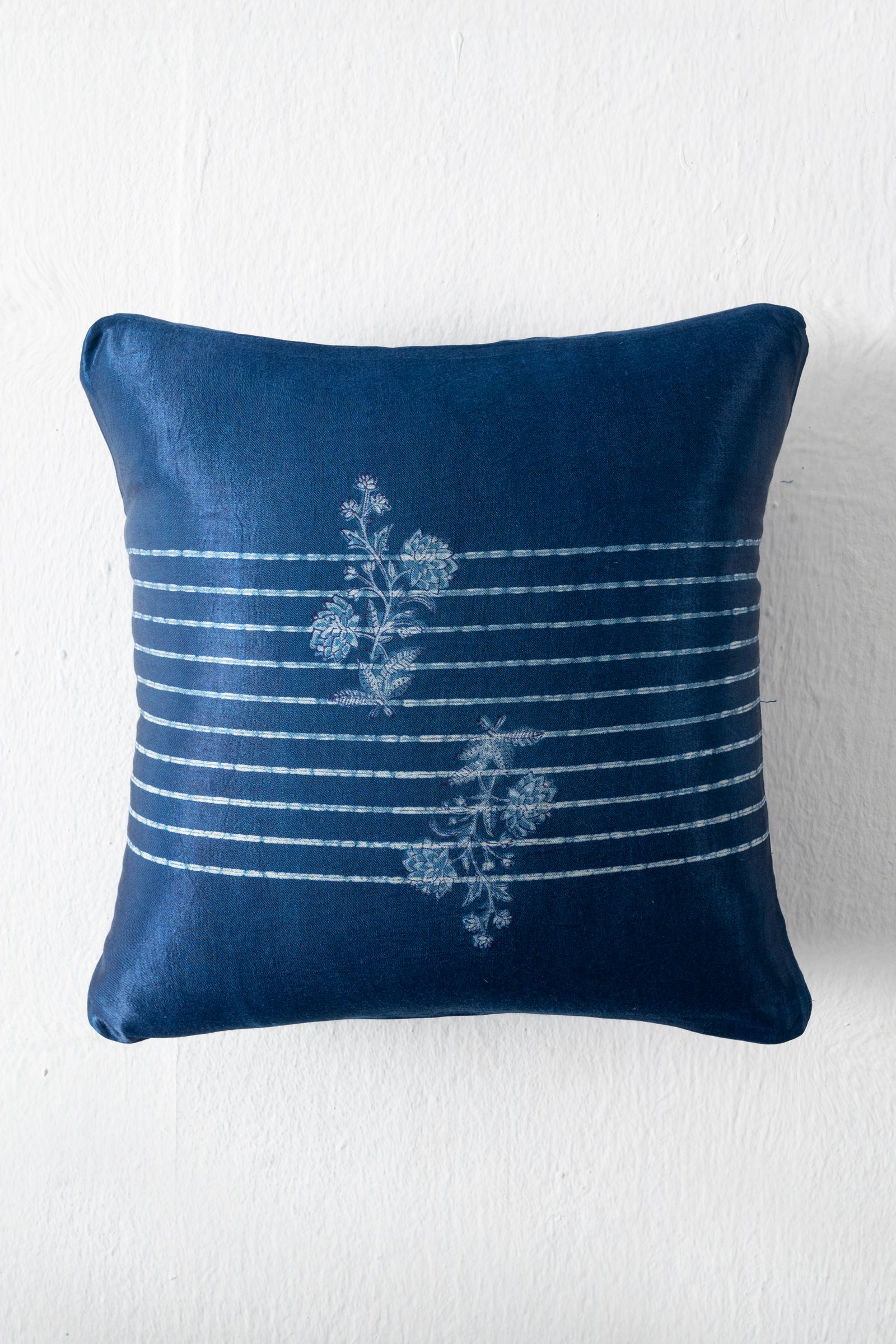 Made from indigo mashru silk fabric, this cushion cover features a beautiful dabu hand block print design of flowers. Enhance your home decor with this elegant and unique accessory, adding a touch of traditional and handmade charm. Perfect for adding a pop of color and texture to any room.