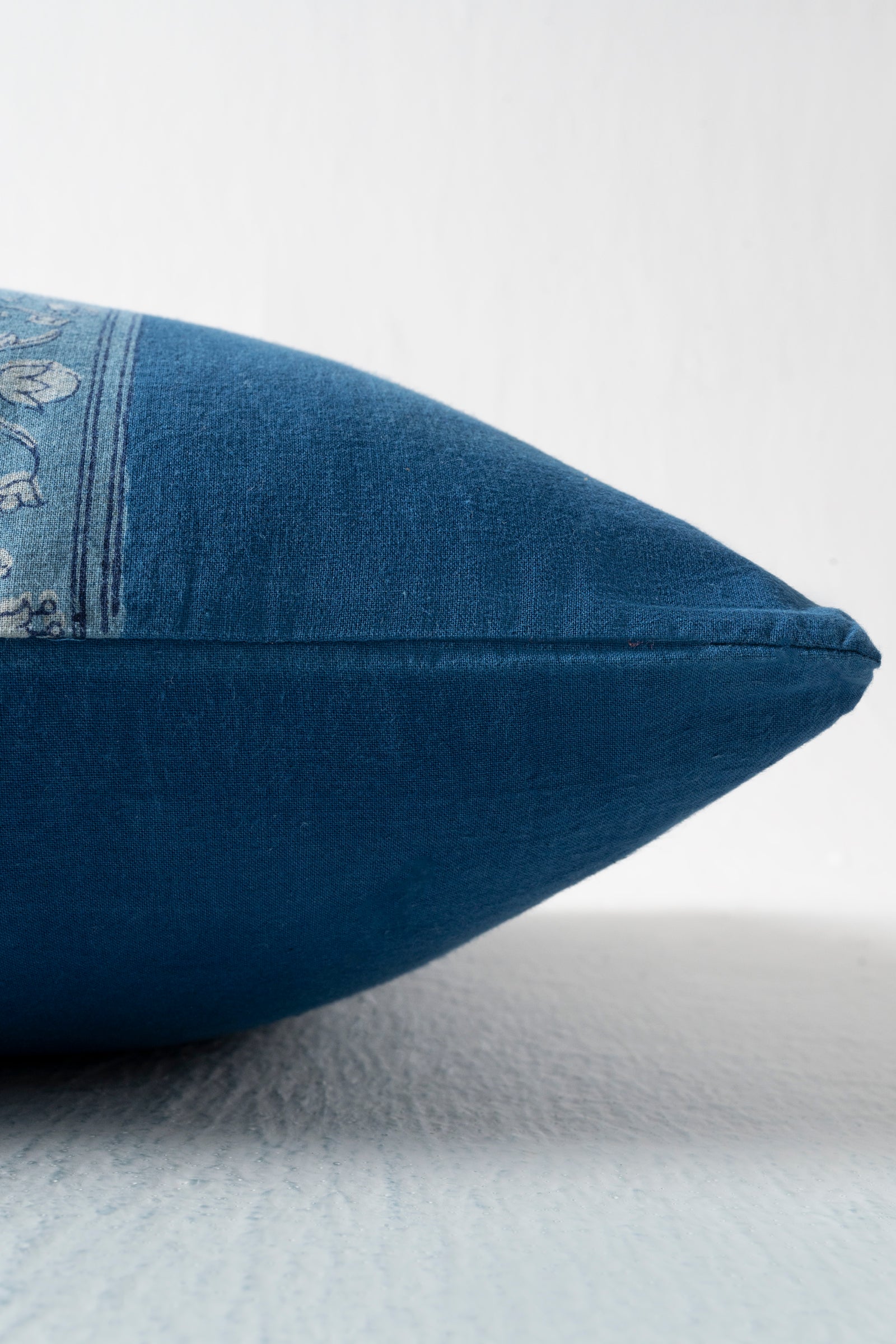 Introducing the SAMA-BUDS CUSHION, expertly made with traditional dabu hand block printing techniques on soft indigo cotton. The beautiful flower print adds a touch of elegance to any room. Experience the benefits of handmade quality and unique design.