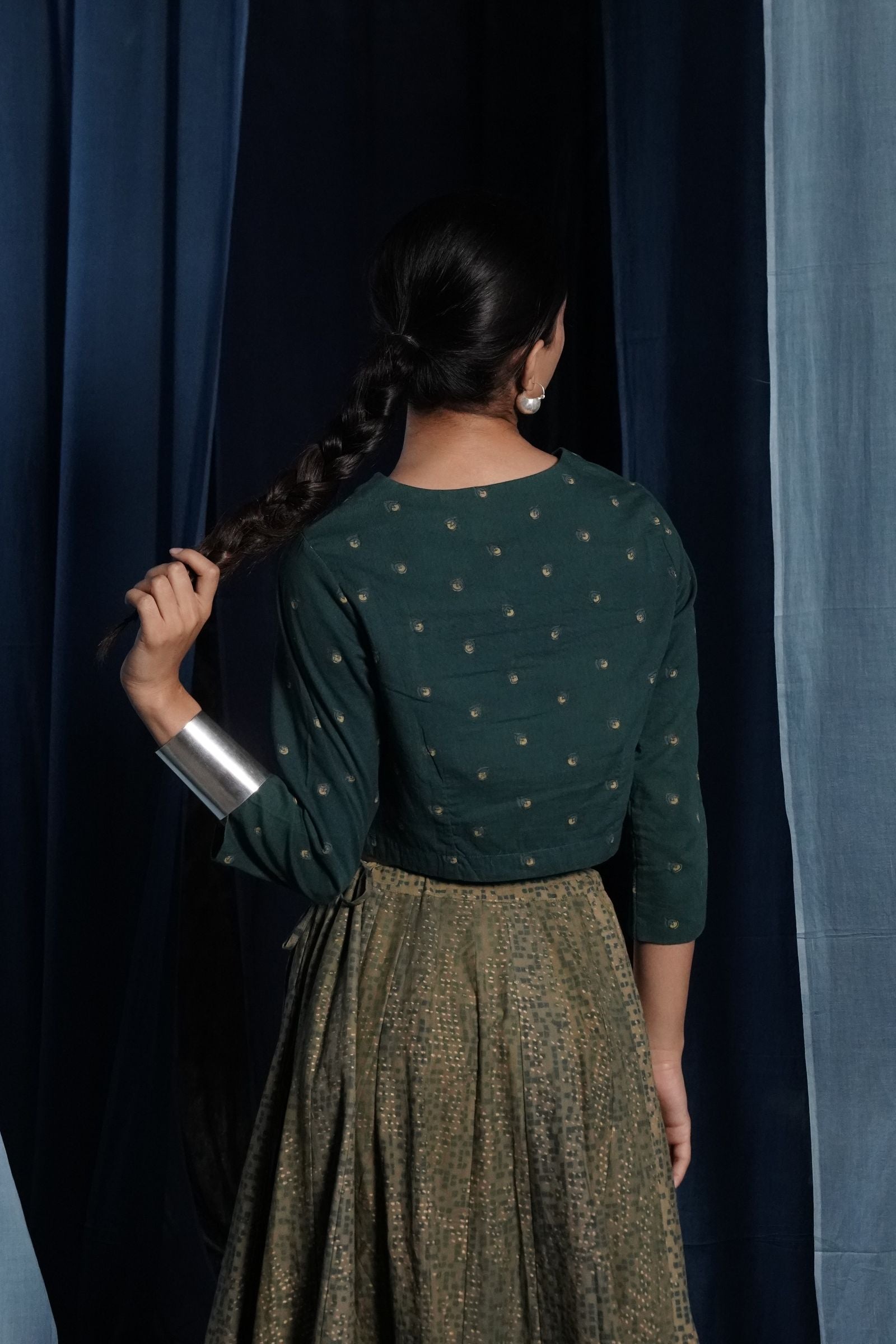 This top is crafted in pure cotton, featuring delicate hand block–printed motifs in deep indigo tones. The minimal silhouette with a front placket and three-quarter sleeves lends effortless grace, while the fine detailing reflects the quiet beauty of traditional craftsmanship. A versatile piece that embodies Aavaran’s philosophy of refined simplicity and artisanal integrity.