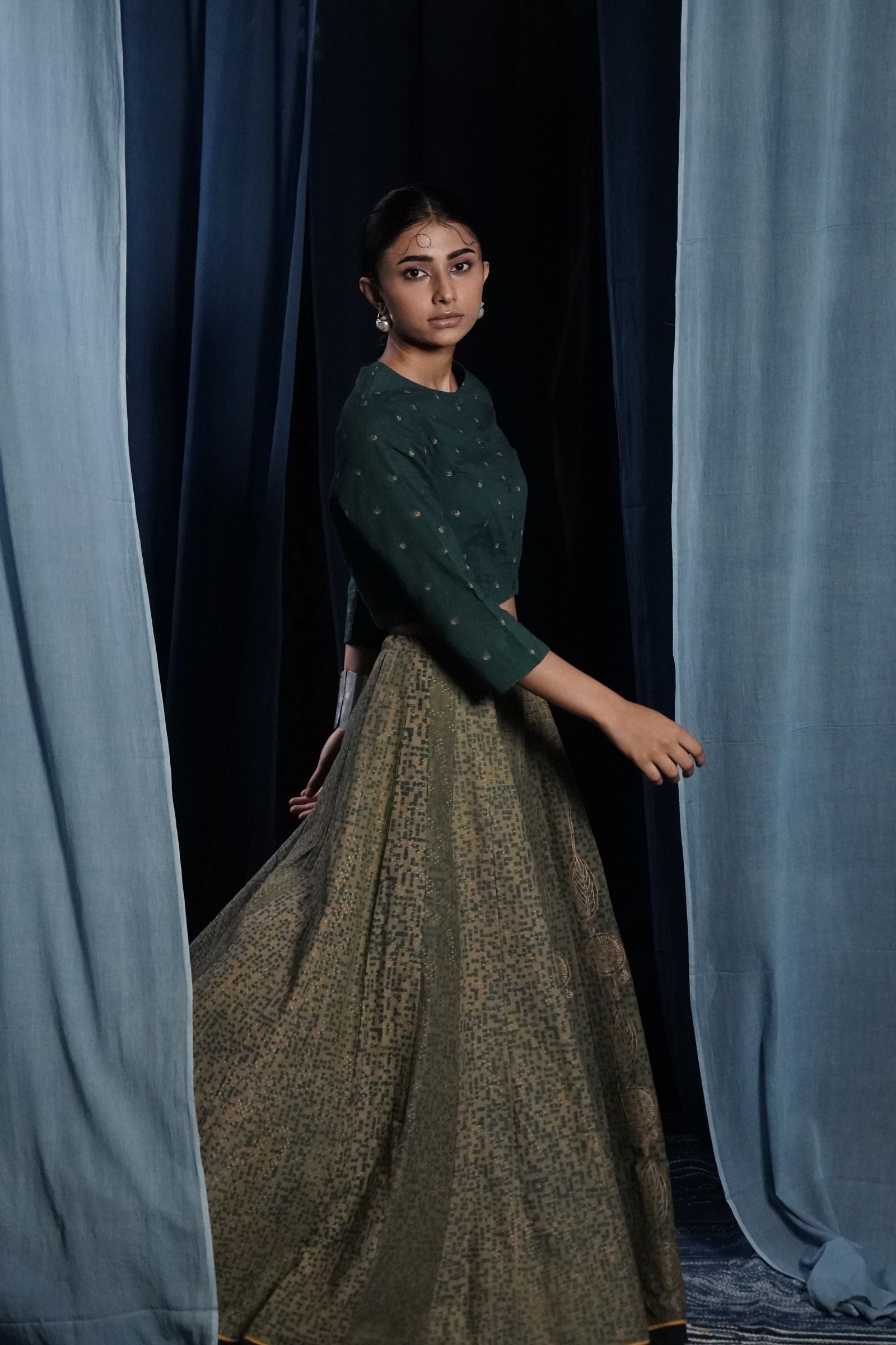 This flared skirt is crafted in pure cotton, featuring an exquisite hand block Dabu print in earthy olive and indigo hues. The flowing silhouette is designed with multiple kalis that lend movement and volume, complemented by handcrafted tassels at the waist and contrast edging along the hem. A seamless blend of tradition and modernity, it reflects Aavaran’s ethos of mindful craftsmanship and effortless elegance.