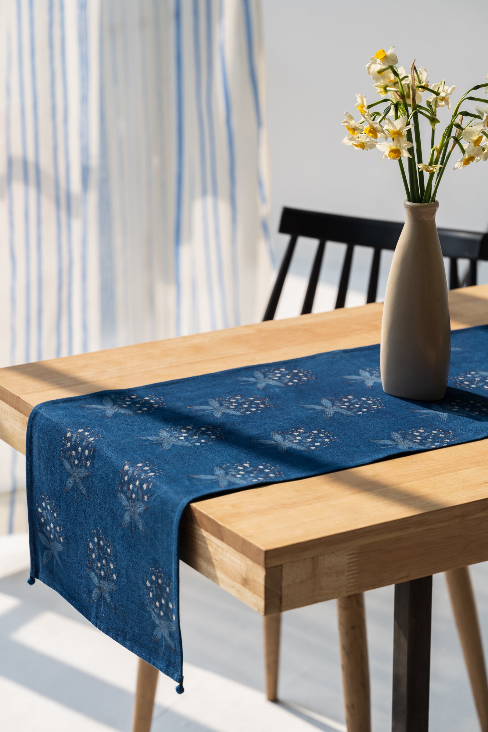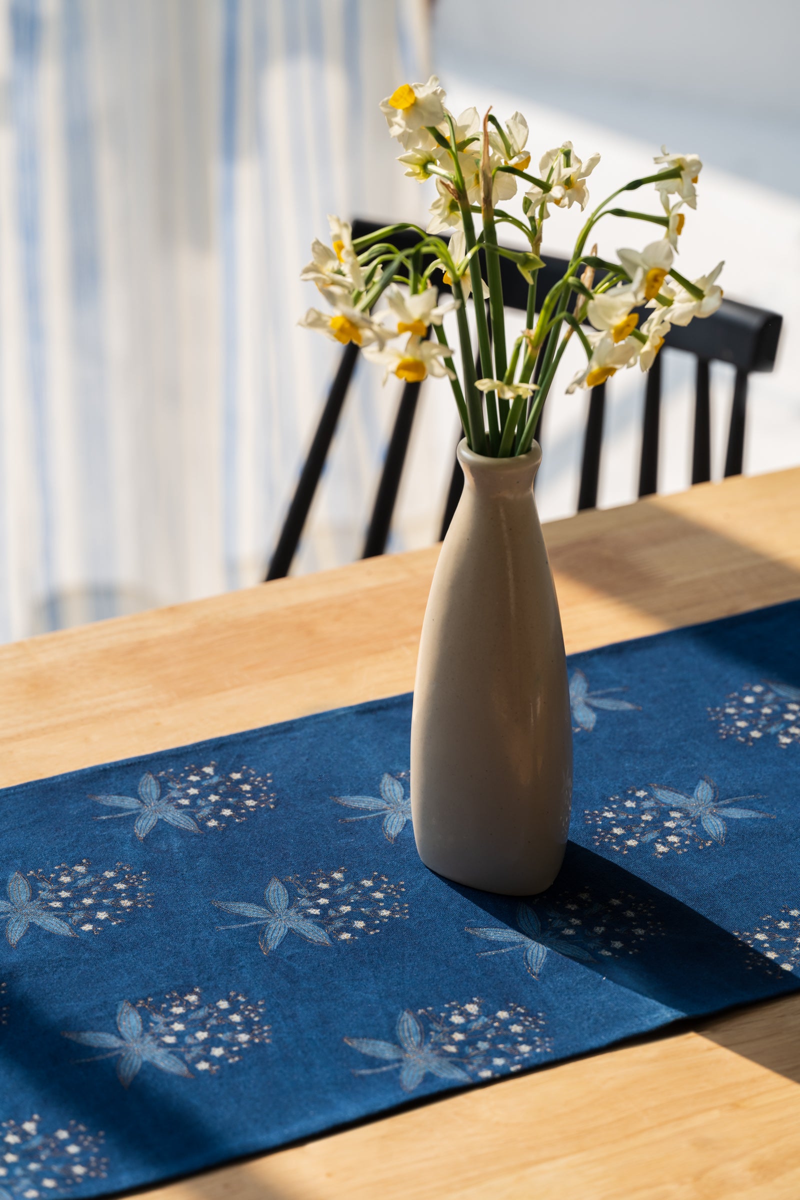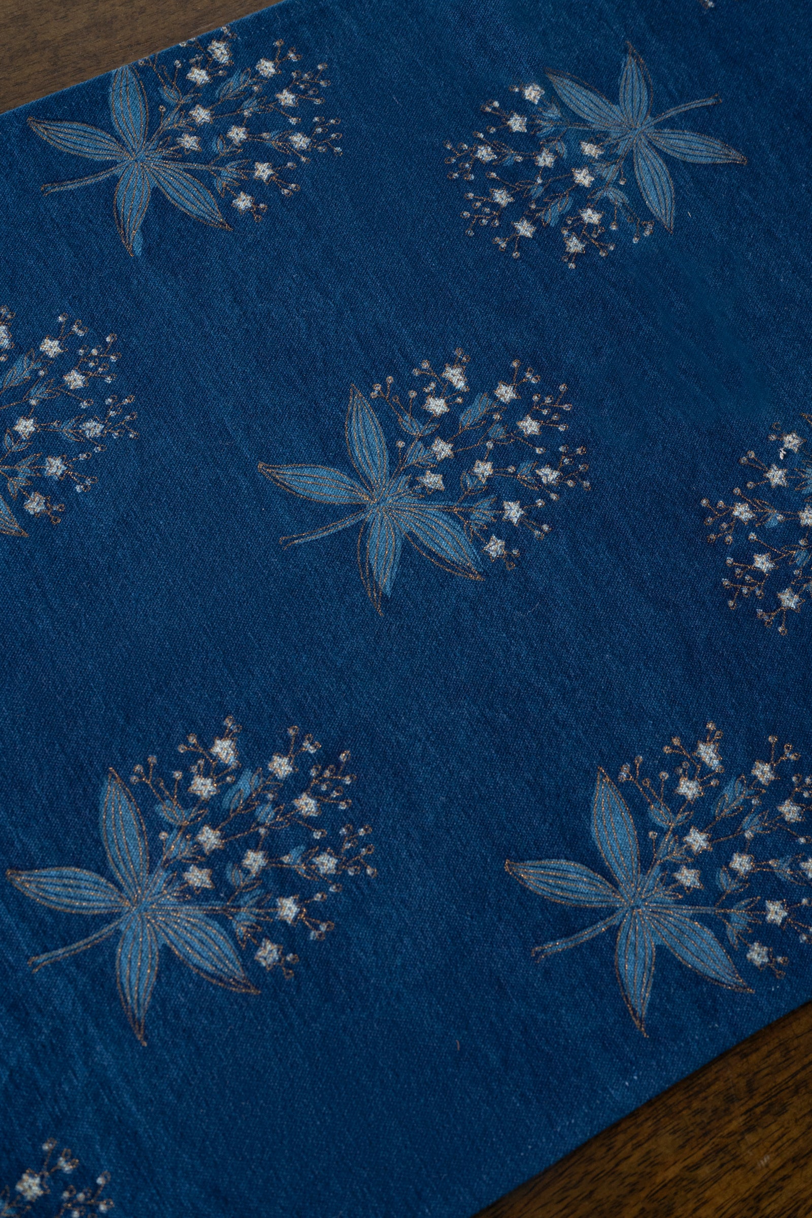 This MANJISHTA BUTA RUNNER features a beautiful indigo dabu hand block print on canvas, complemented by delicate Thread button details. Elevate your table setting with this exquisite and unique piece, showcasing traditional craftsmanship and adding a touch of elegance to any occasion.
