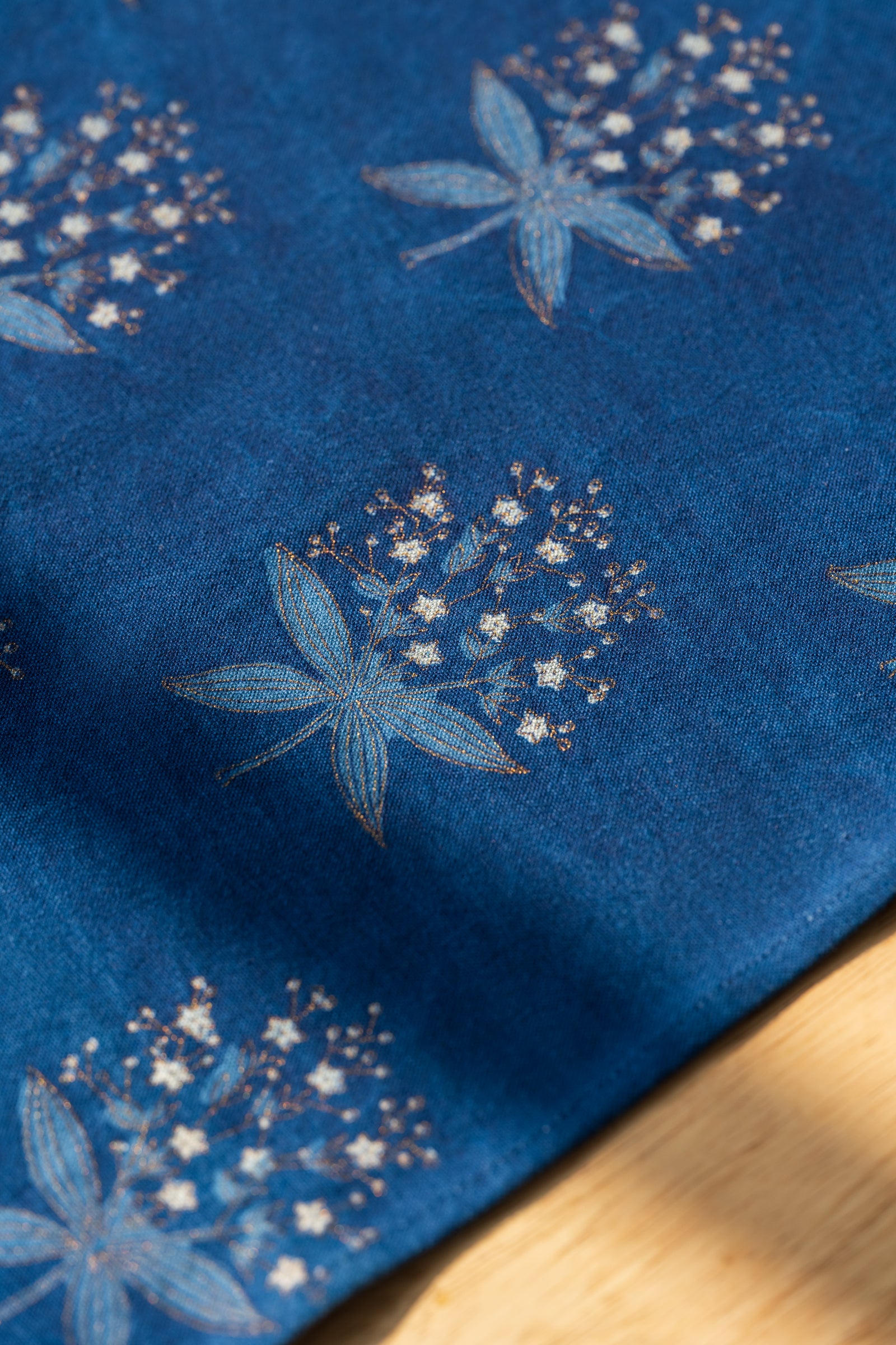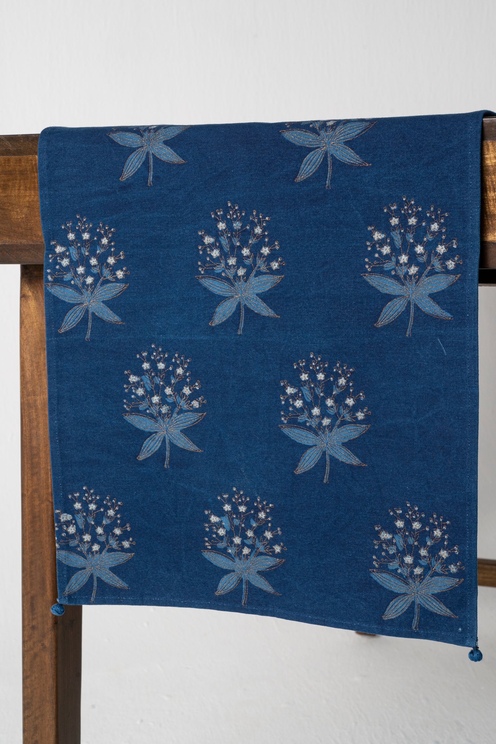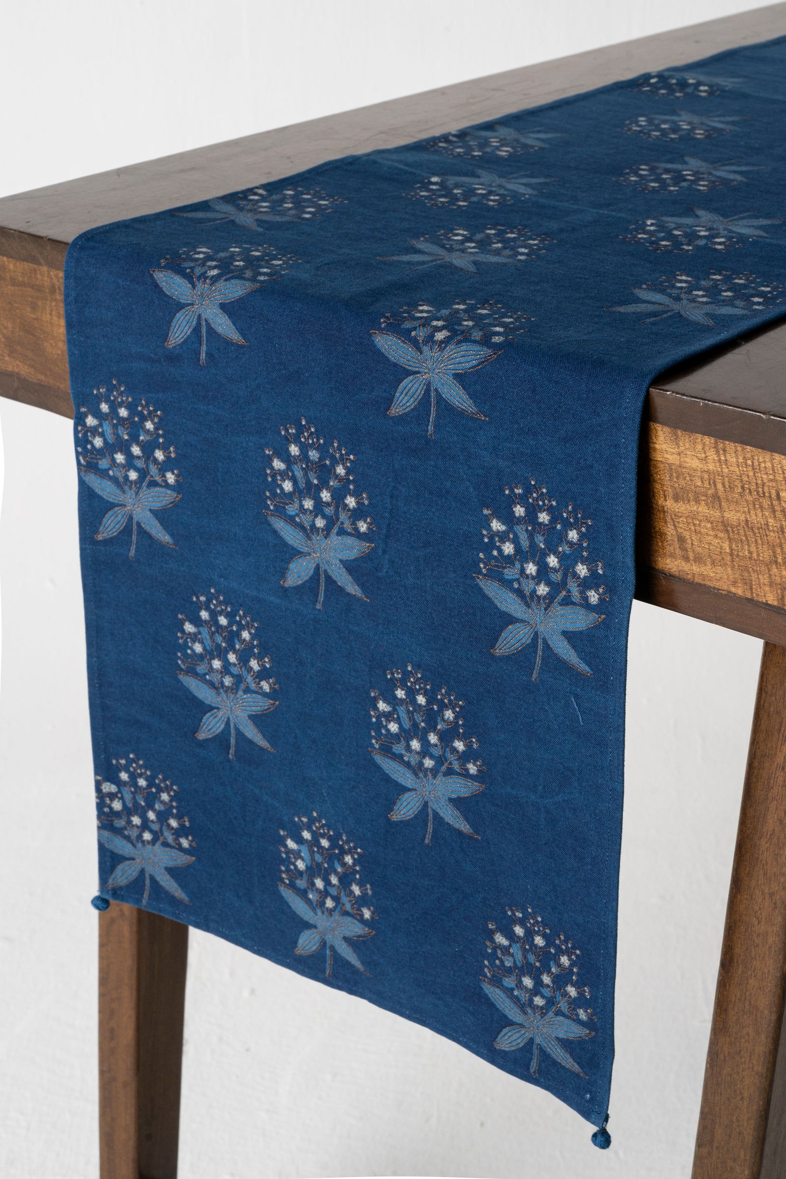 This MANJISHTA BUTA RUNNER features a beautiful indigo dabu hand block print on canvas, complemented by delicate Thread button details. Elevate your table setting with this exquisite and unique piece, showcasing traditional craftsmanship and adding a touch of elegance to any occasion.