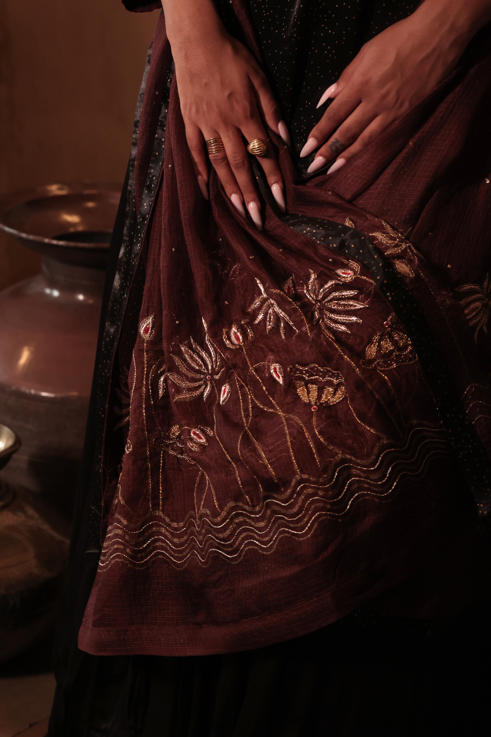 Dryclean only. Store in cool/dry place. Iron at low/medium temperature.