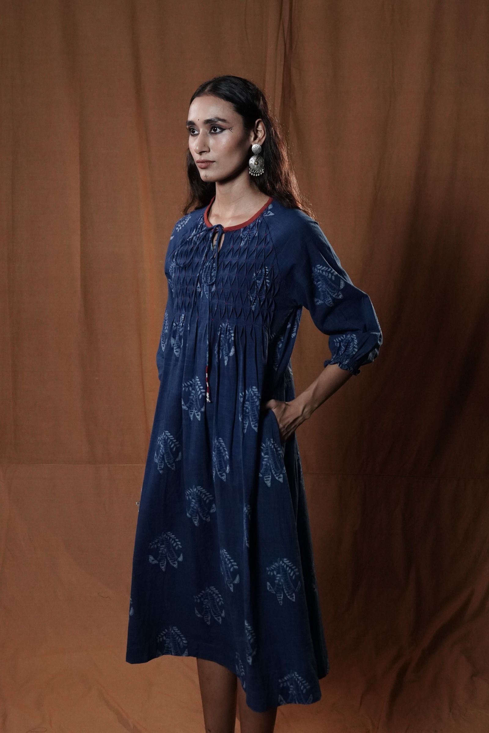 Fit, Neckline & Sleeves: Relaxed A-line silhouette with a round neckline, tie-up detail, and three-quarter sleeves with gentle gathers