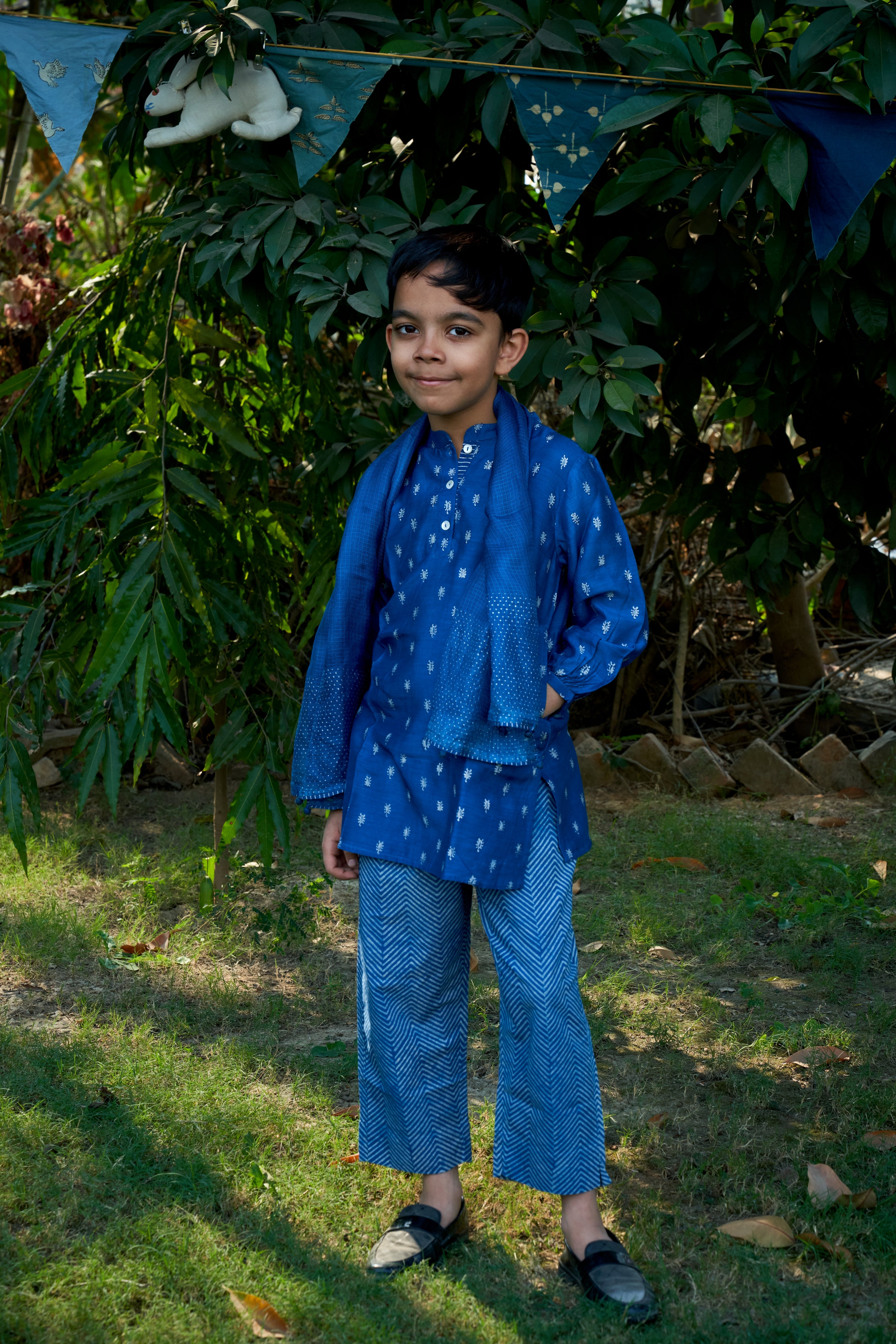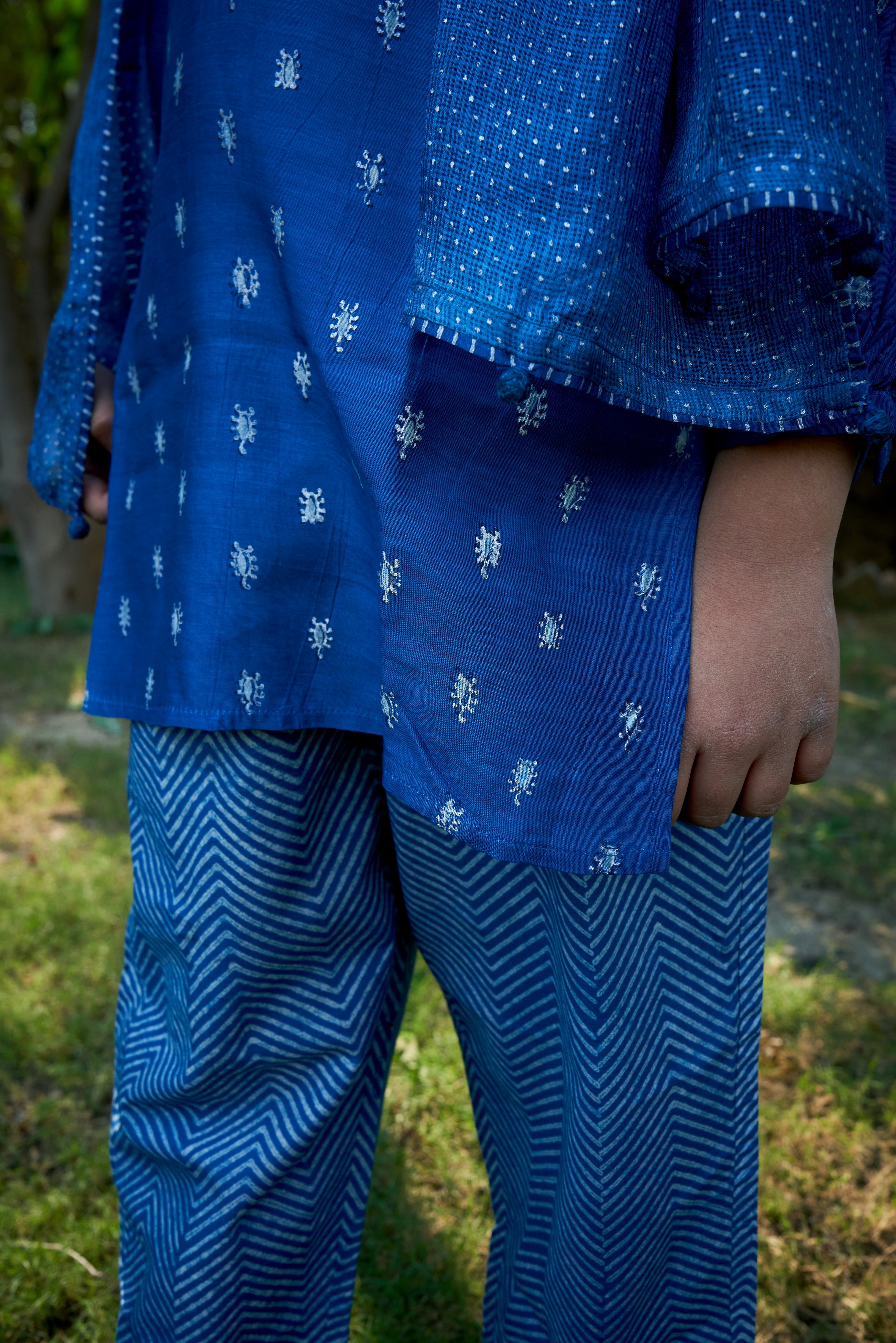 Crafted from soft, breathable cotton in a rich indigo hue, these pants feature subtle leheriya patterns for a touch of traditional charm. Designed for comfort and ease of movement, they make a versatile addition to any little one’s wardrobe, perfect for both play and special occasions.