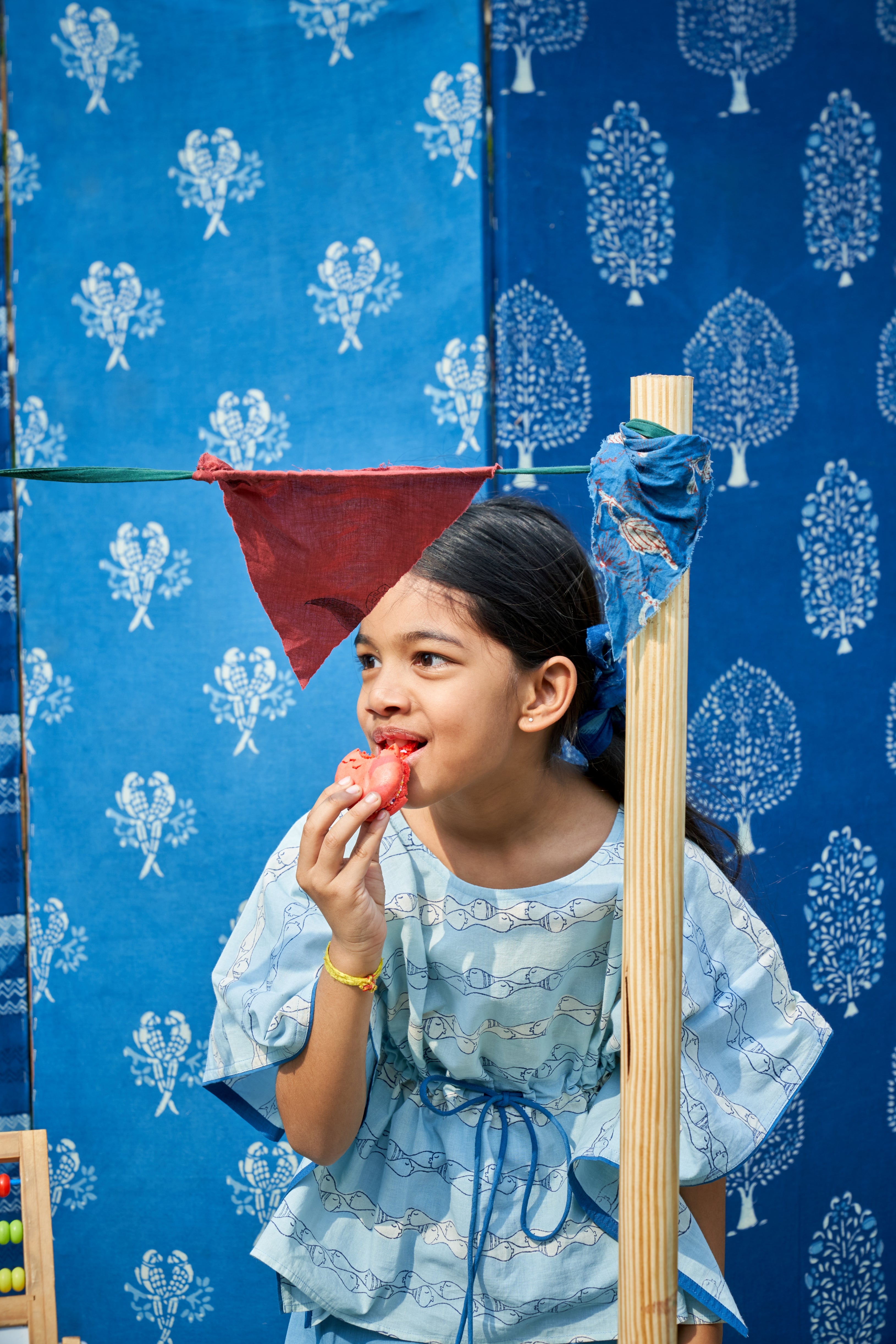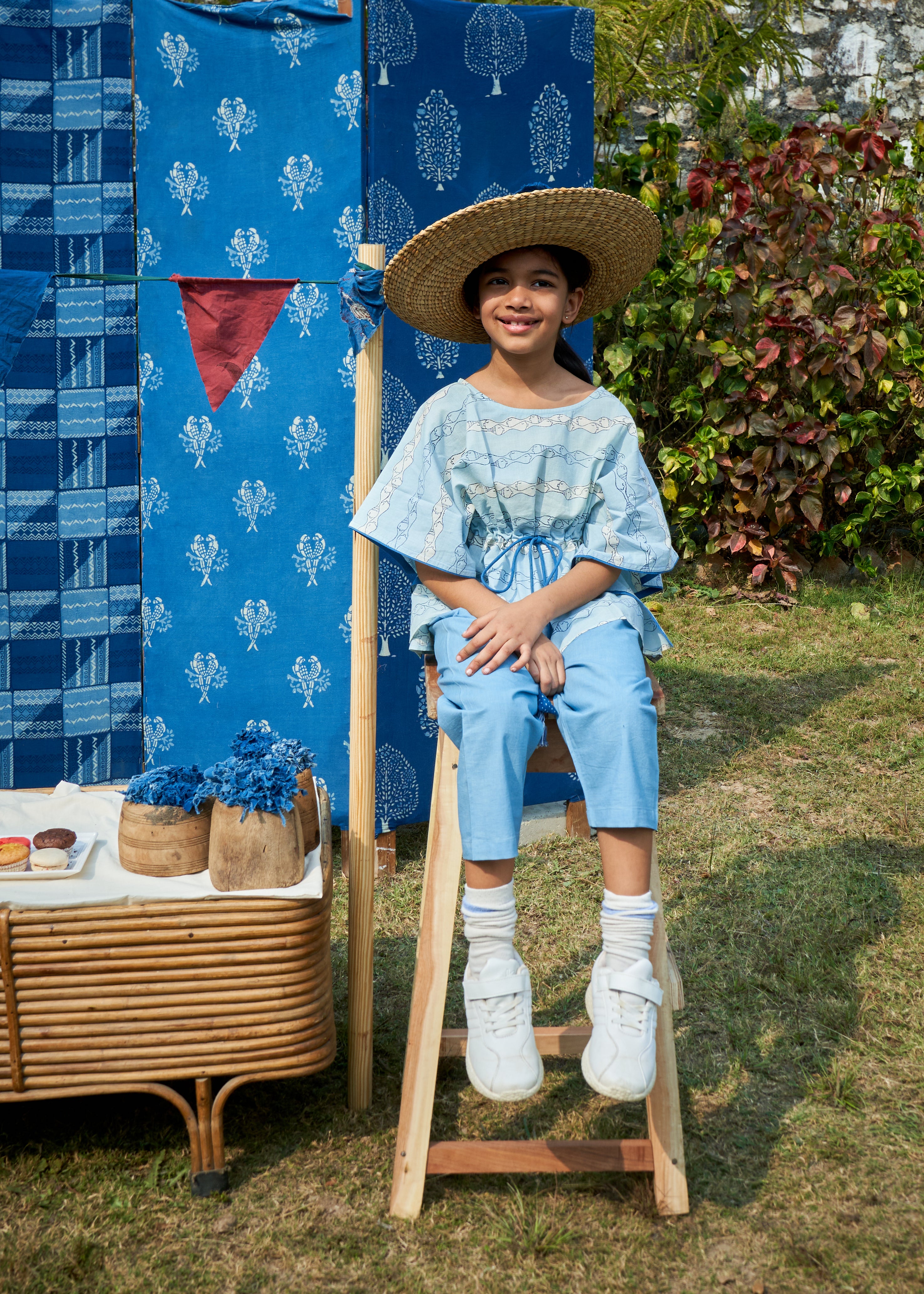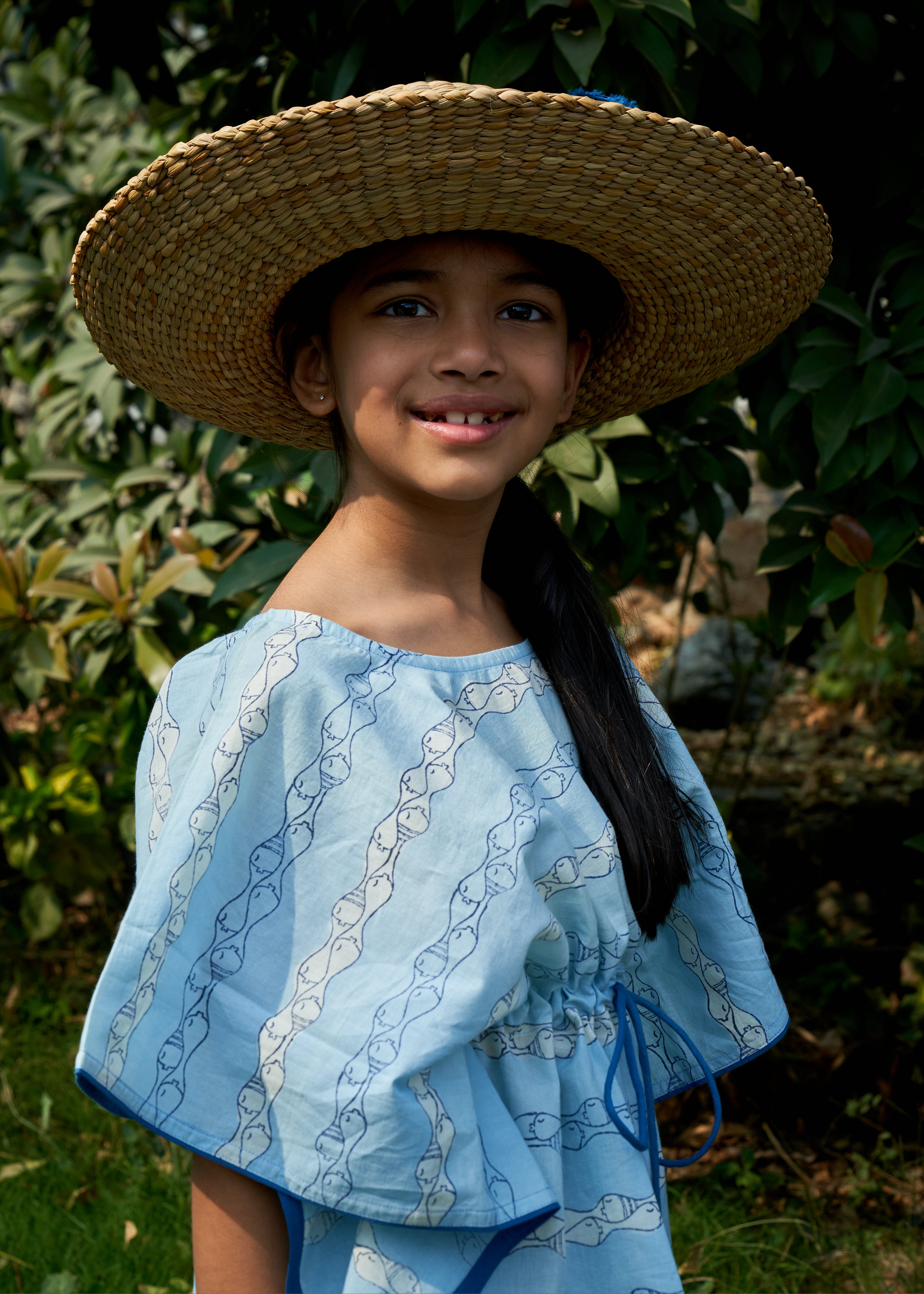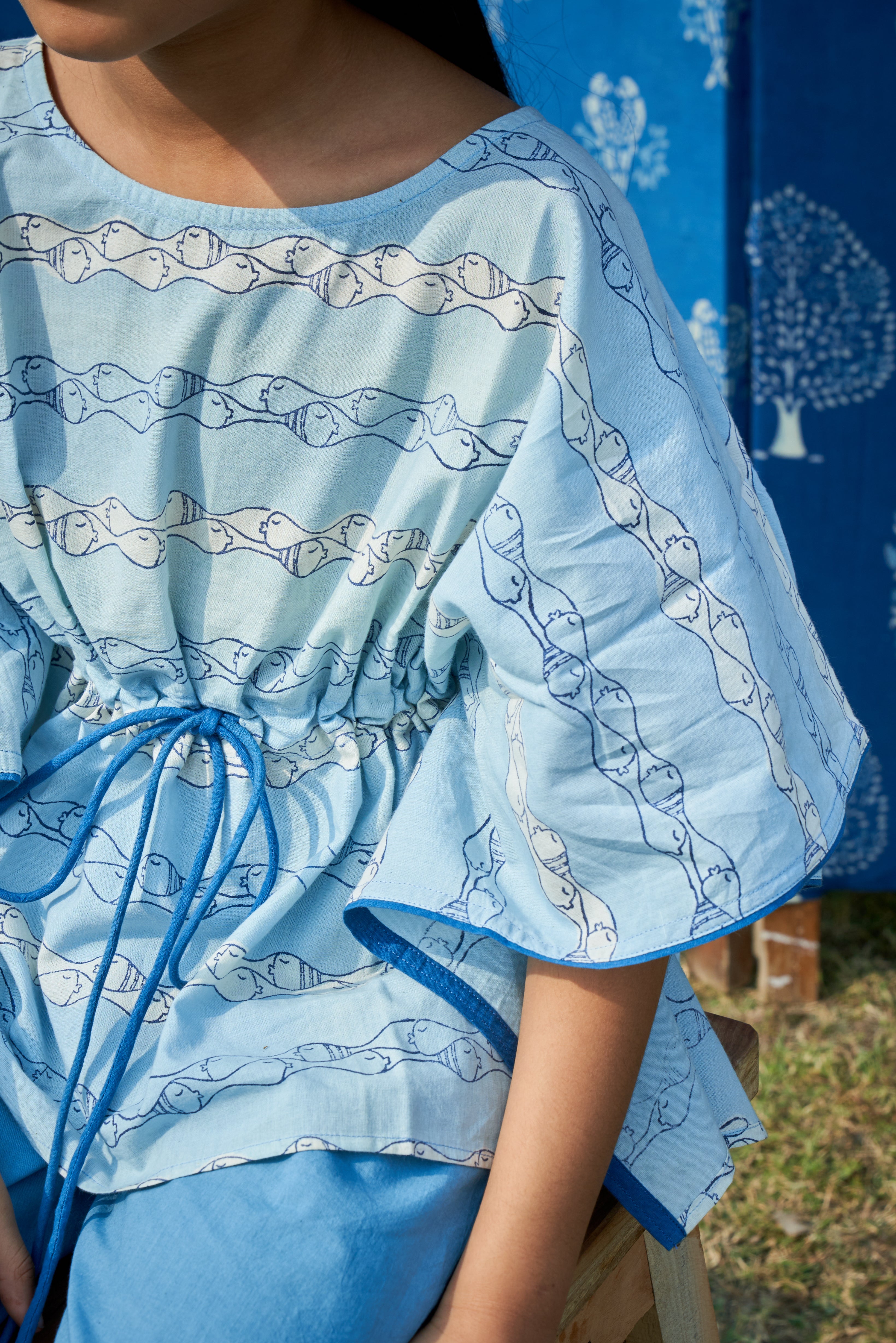 A breezy blend of comfort and charm, this cotton kaftan in a soft powder blue hue is adorned with playful fish motifs. Its relaxed silhouette ensures ease of movement, making it a perfect choice for little ones to stay stylish and comfortable all day long.