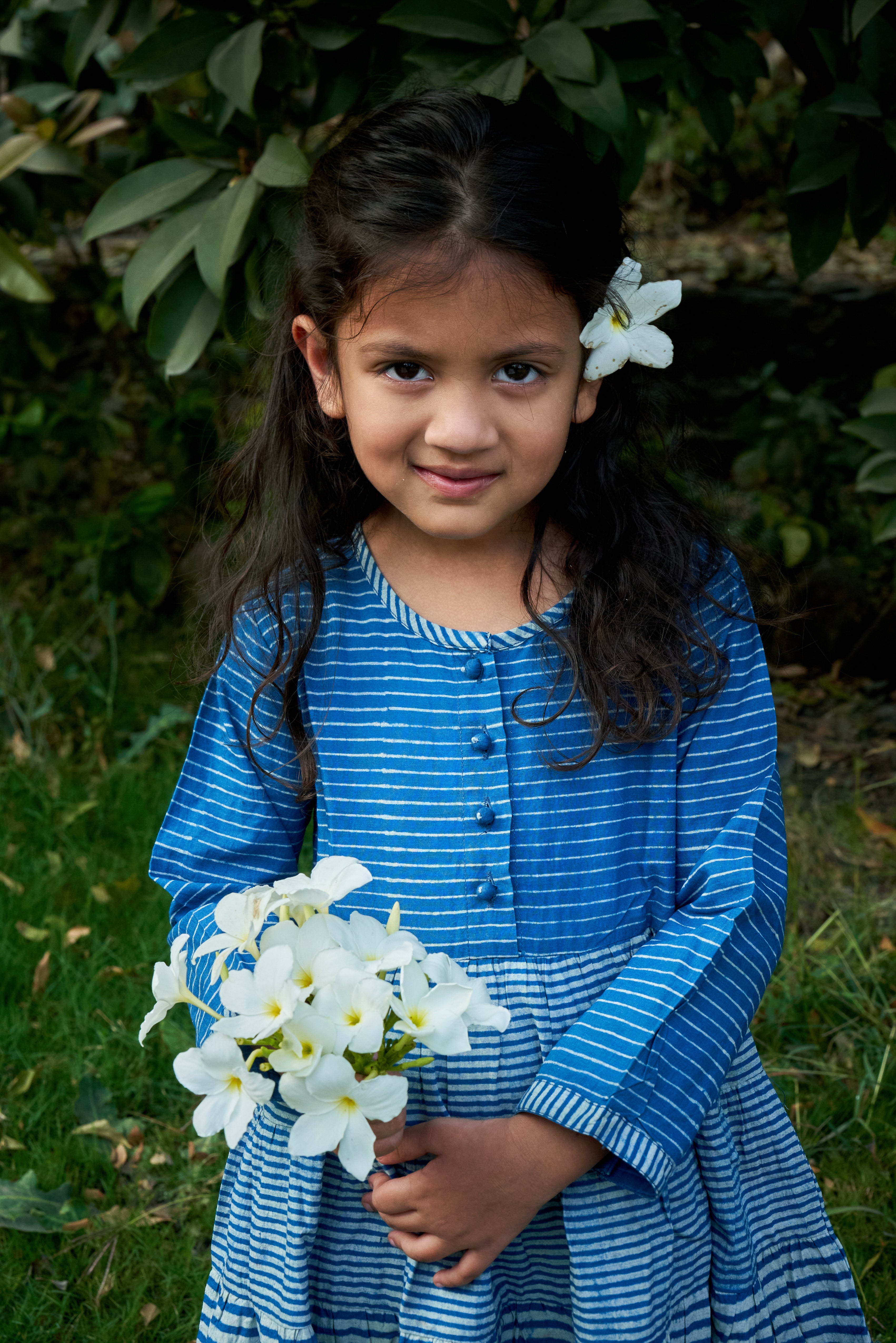 Effortlessly elegant, this indigo cotton dress features a tiered silhouette for a flowy, playful charm. Designed for comfort and movement, its breathable fabric ensures all-day ease, making it a perfect choice for both special occasions and everyday adventures.