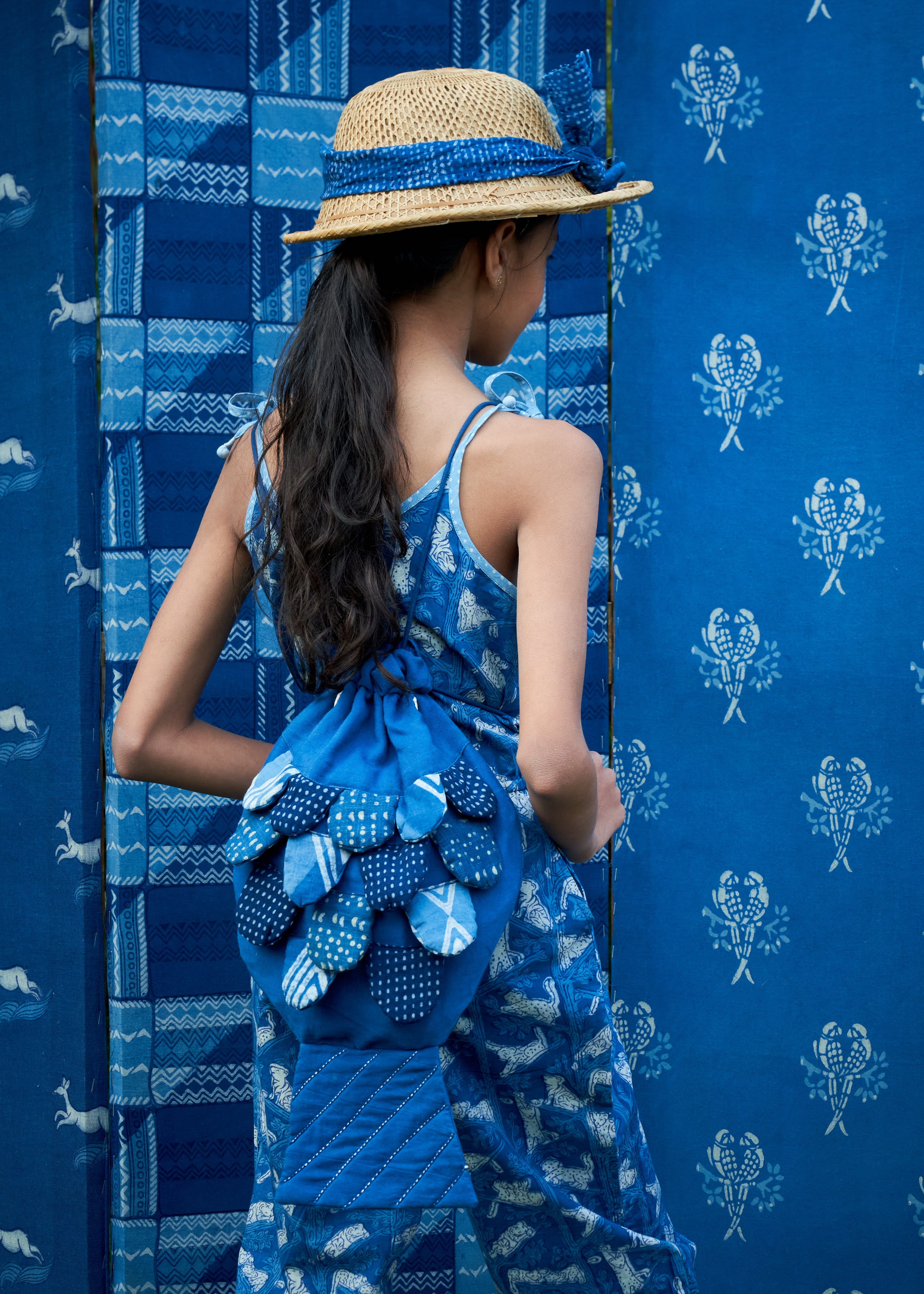 A beautifully handcrafted indigo cotton bag featuring intricate fish-scale appliqué detailing. This unique drawstring bag combines traditional block-printing techniques with contemporary design, making it a stylish and eco-friendly accessory for everyday use.