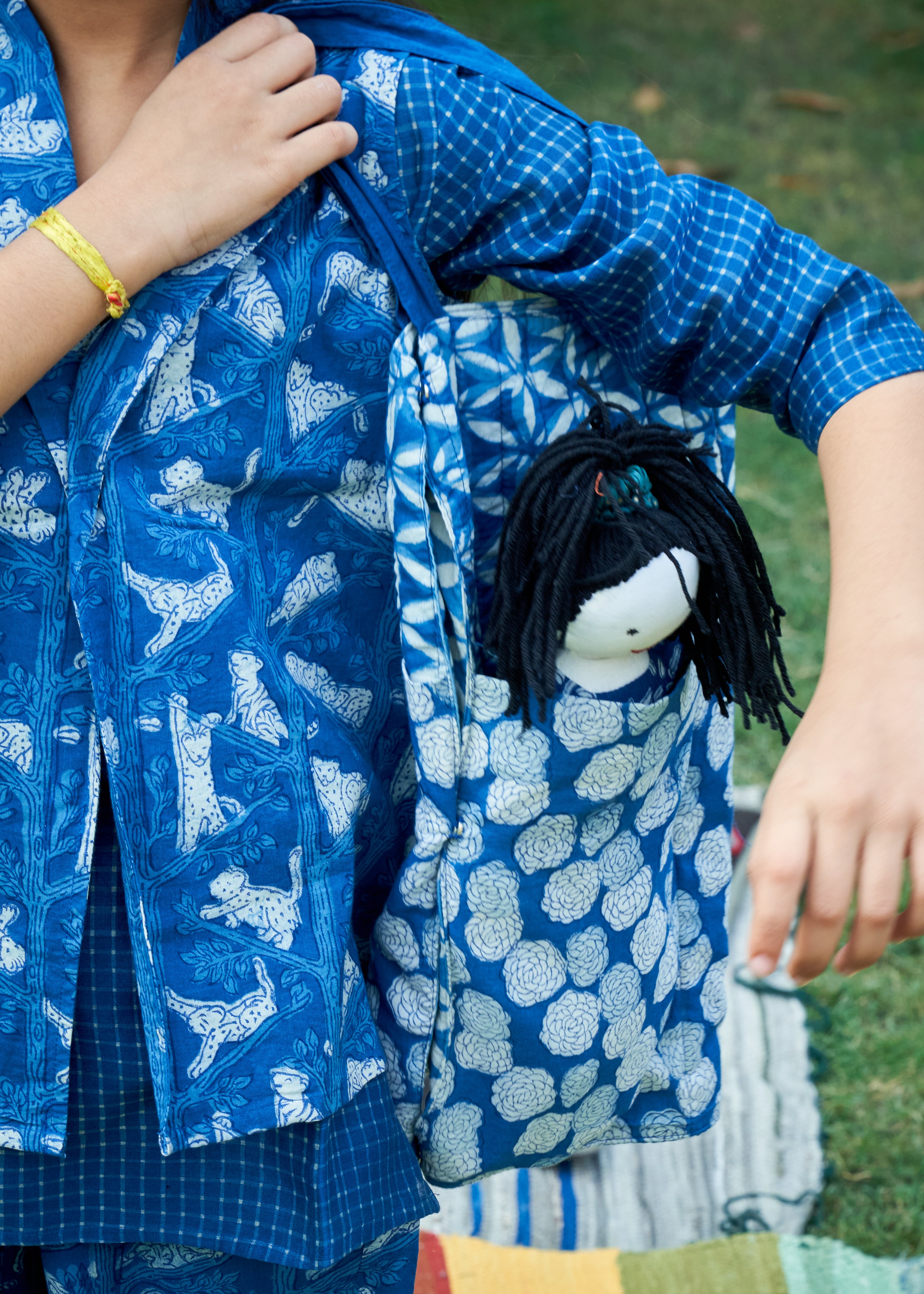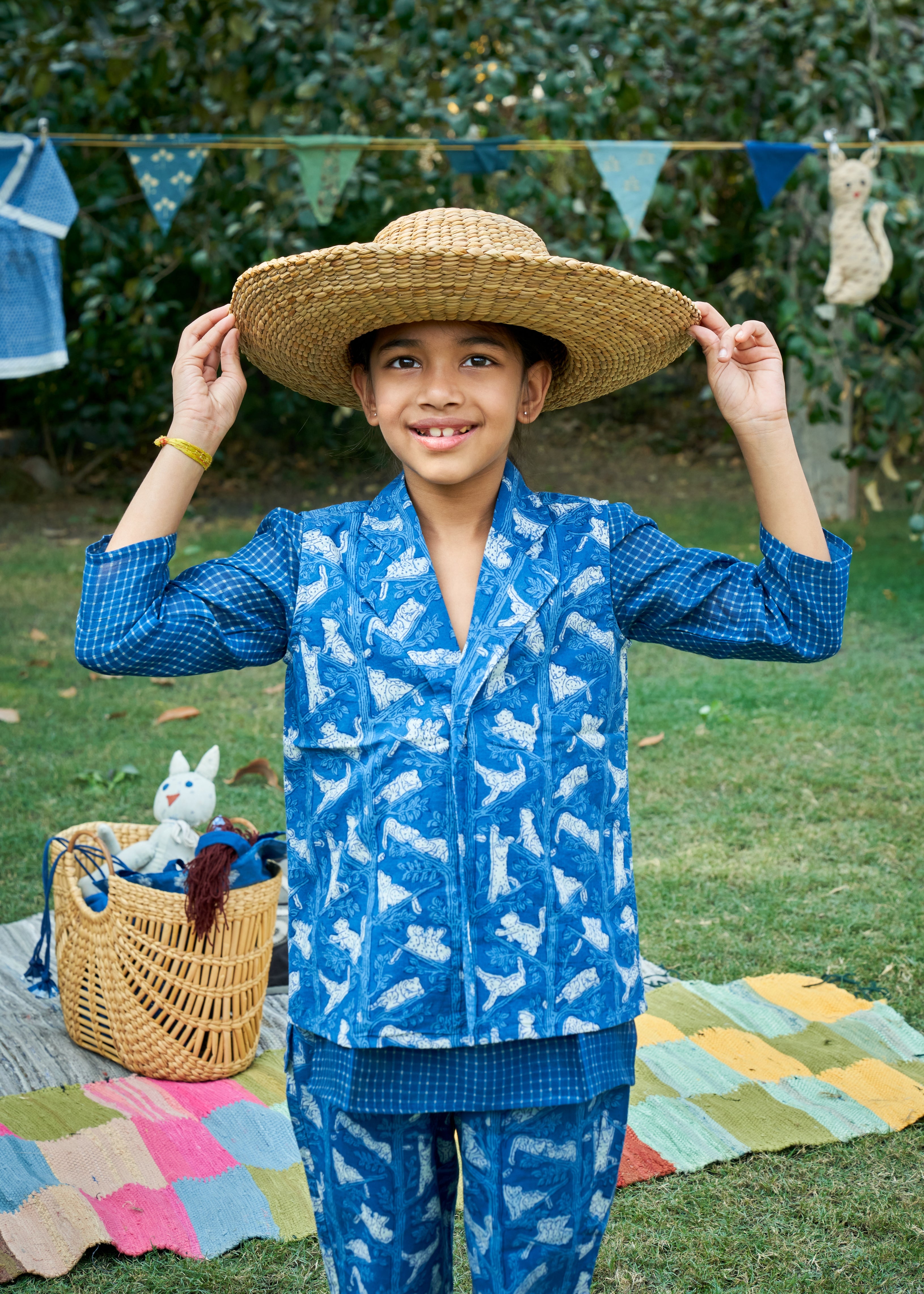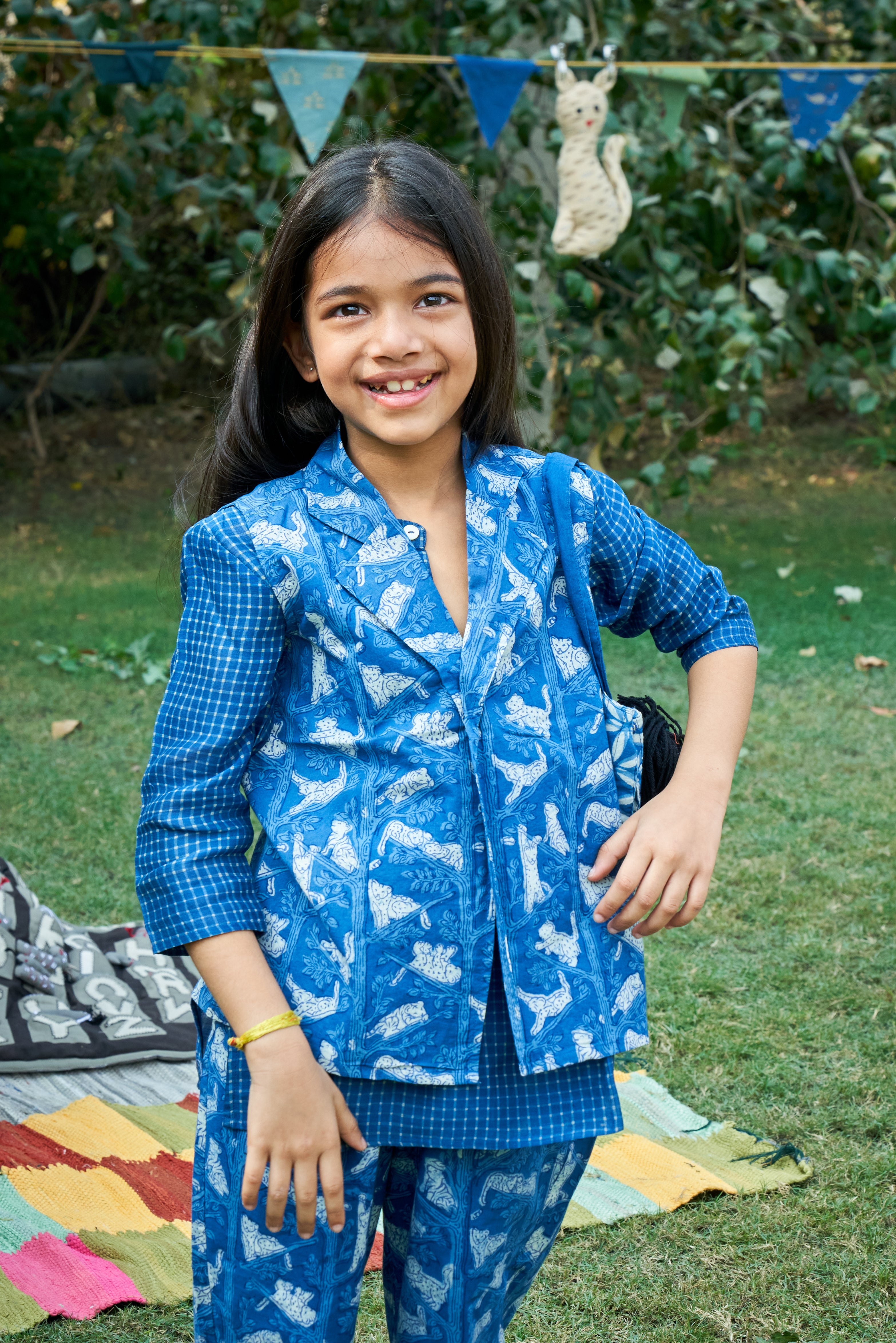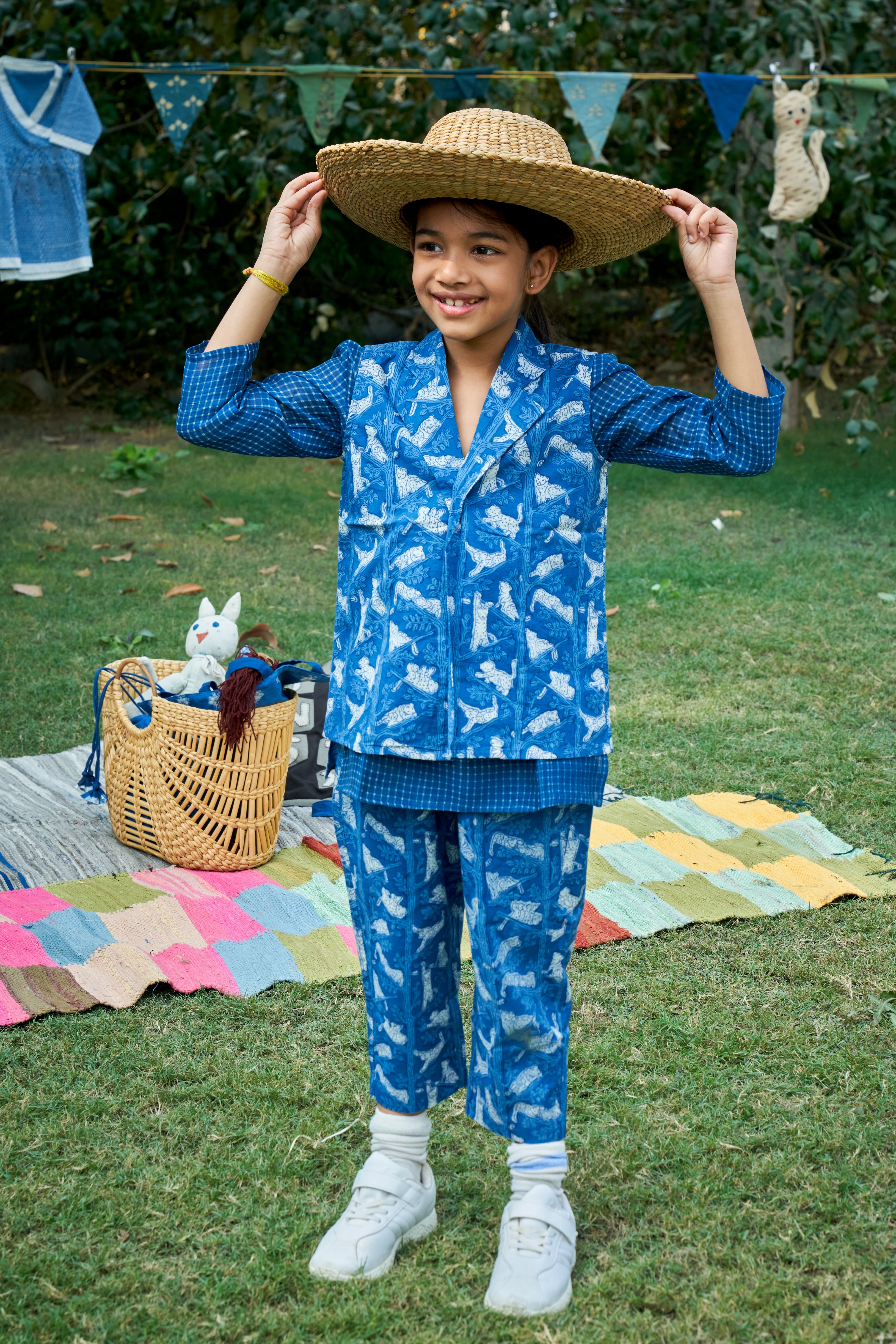 A stylish fusion of tradition and comfort, this jacket and pant set is crafted from 100% cotton in a rich indigo hue. Designed for little trendsetters, it offers effortless style with breathable ease, making it perfect for both special occasions and everyday adventures.