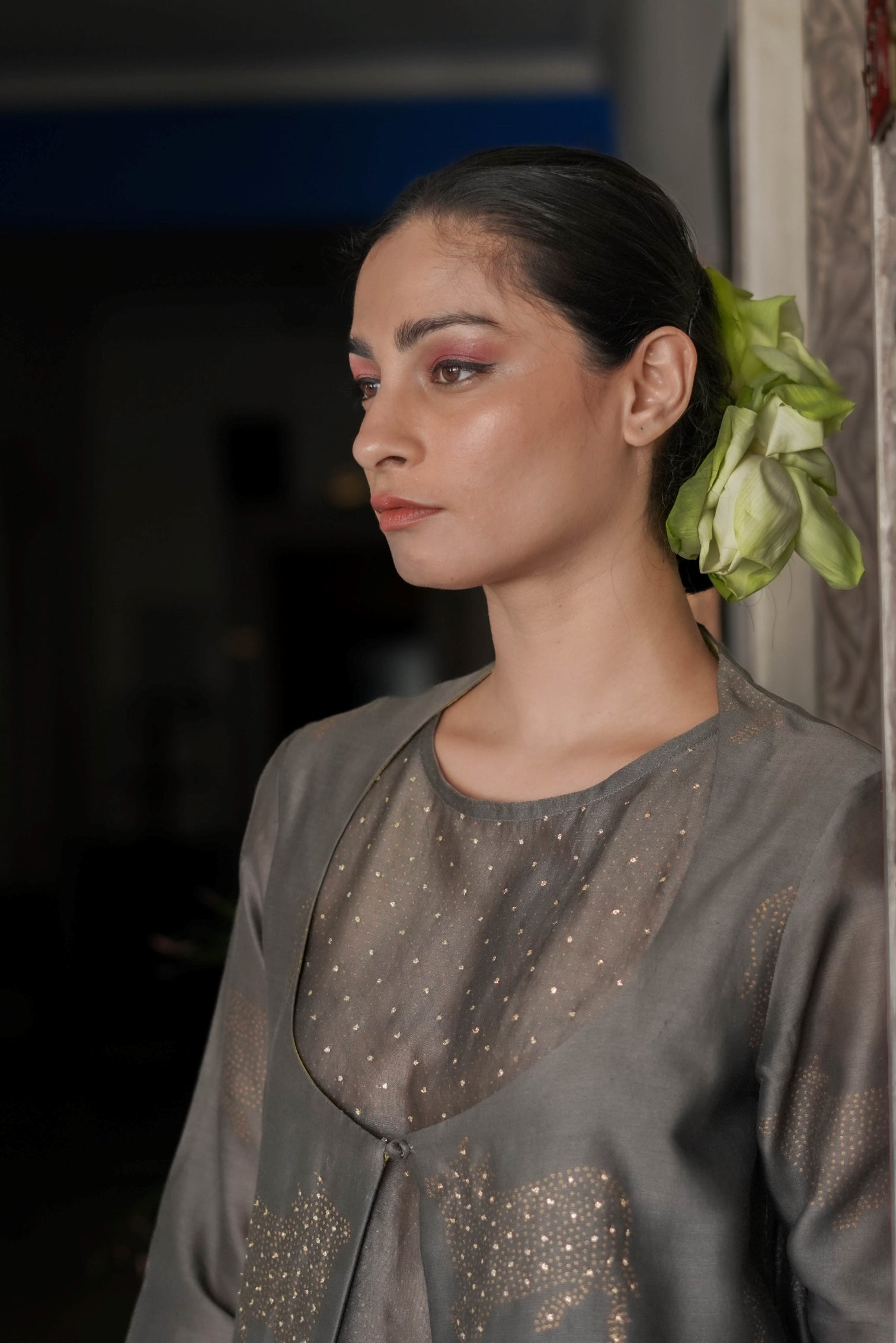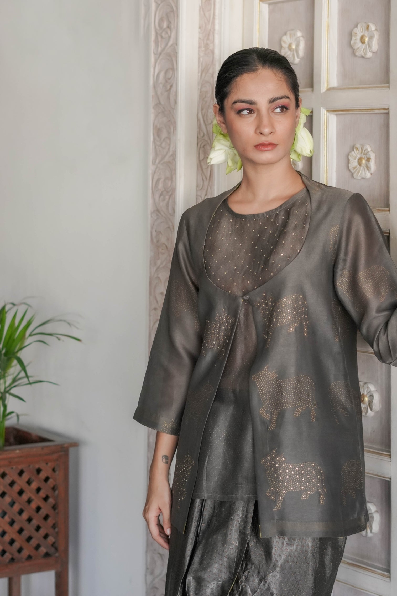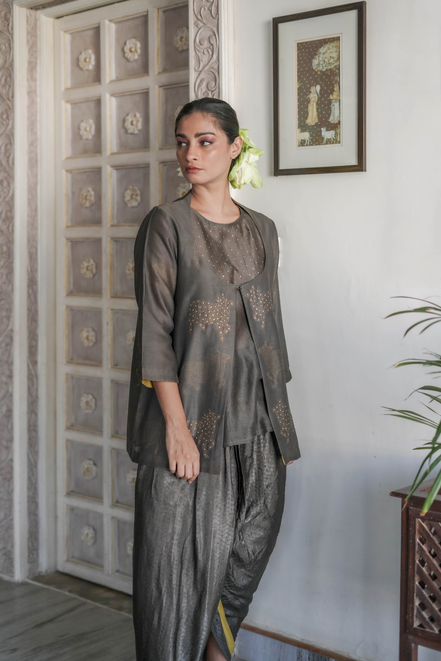 Expertly dyed and printed, the NANDI TOP features luxurious chanderi silk adorned with traditional mukesh work. Paired with a comfortable mashru silk dhoti pant, this set offers a sophisticated and elegant look. Perfect for special occasions or adding a touch of culture to your wardrobe.