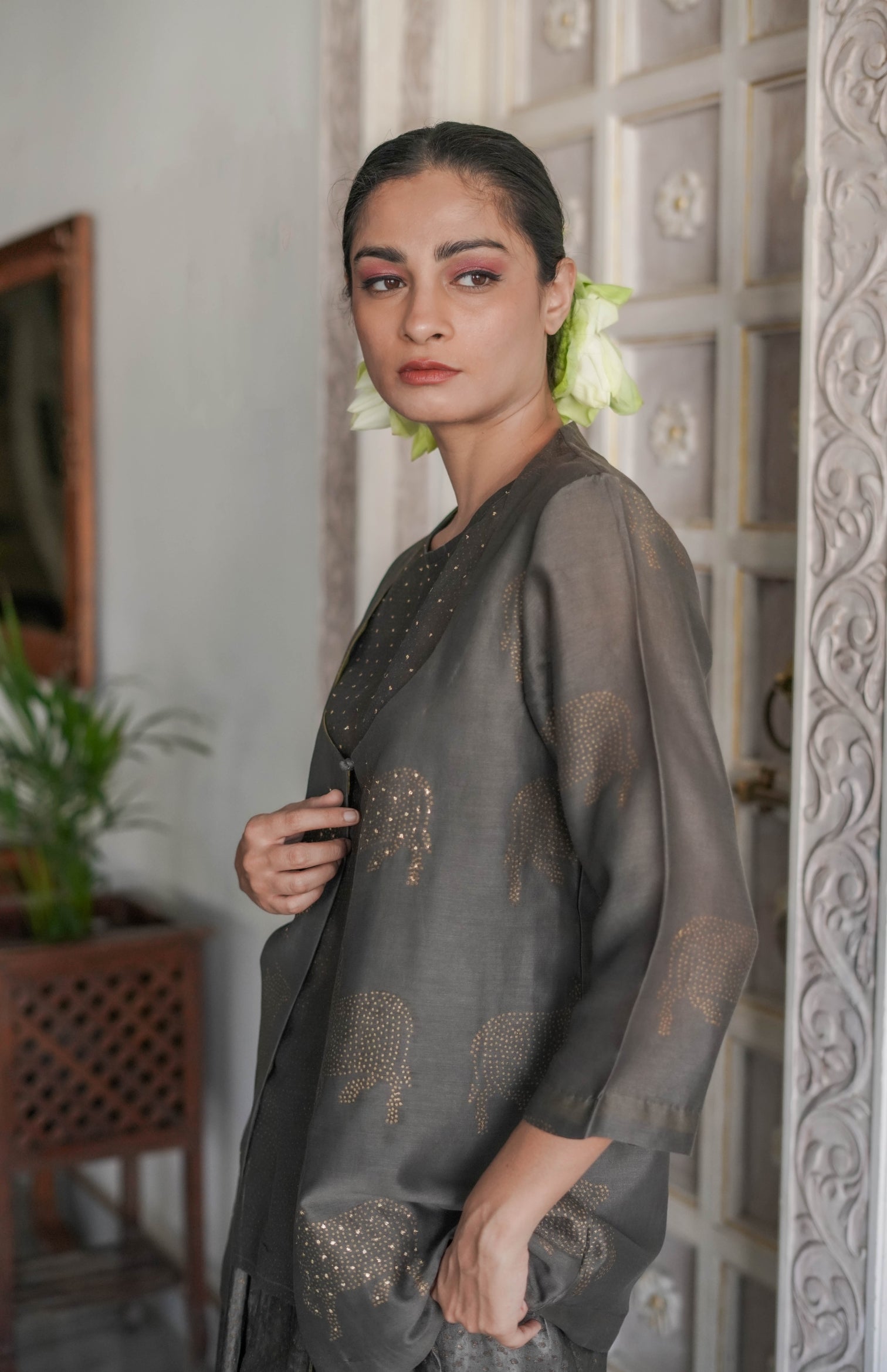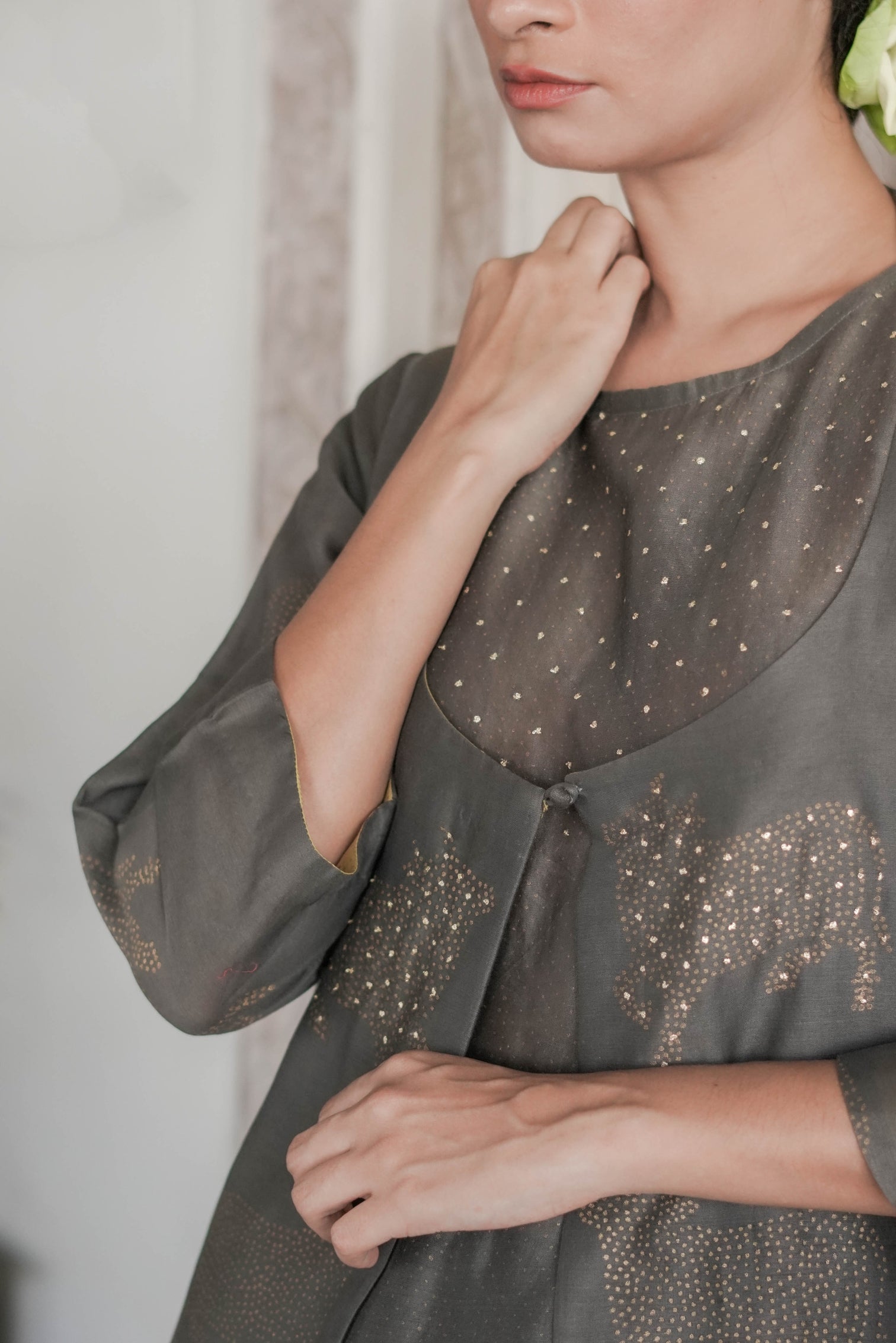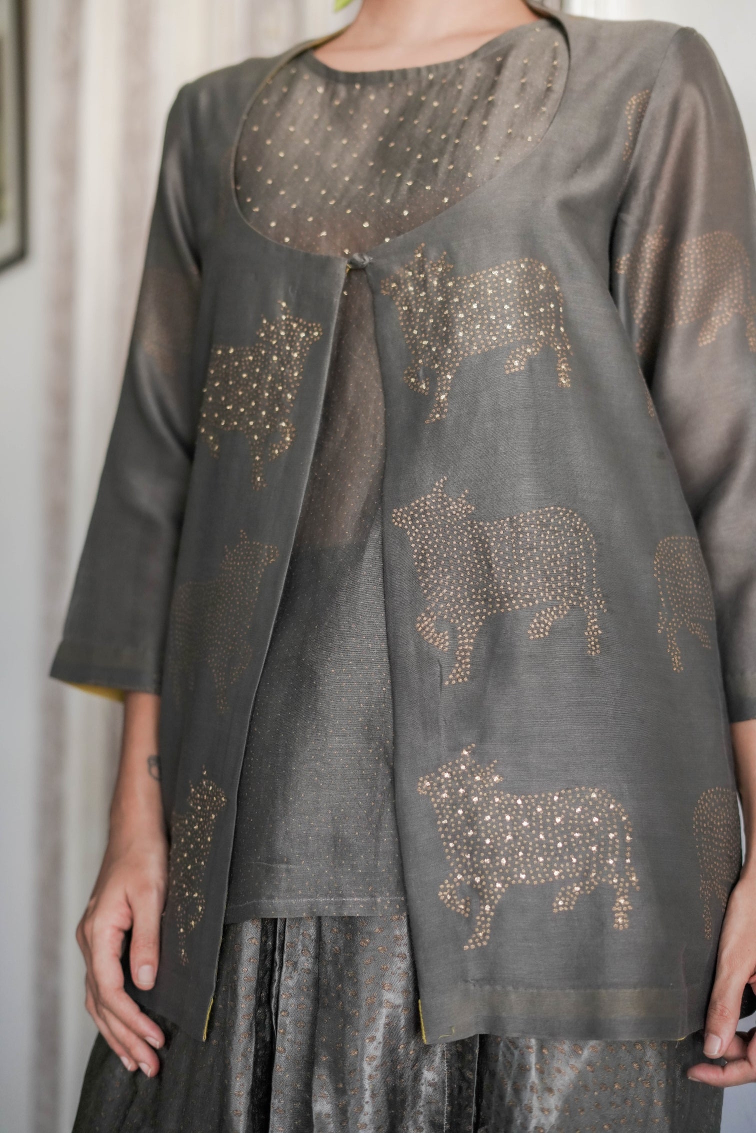 Expertly dyed and printed, the NANDI TOP features luxurious chanderi silk adorned with traditional mukesh work. Paired with a comfortable mashru silk dhoti pant, this set offers a sophisticated and elegant look. Perfect for special occasions or adding a touch of culture to your wardrobe.