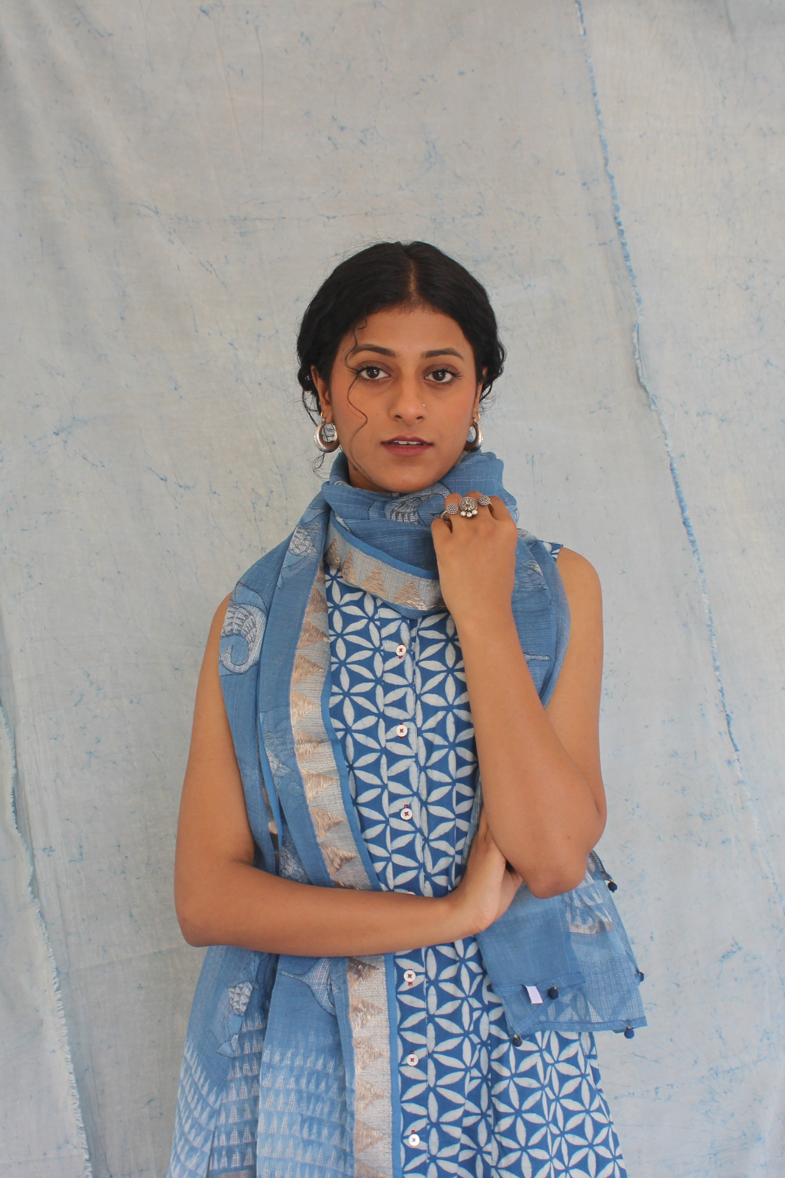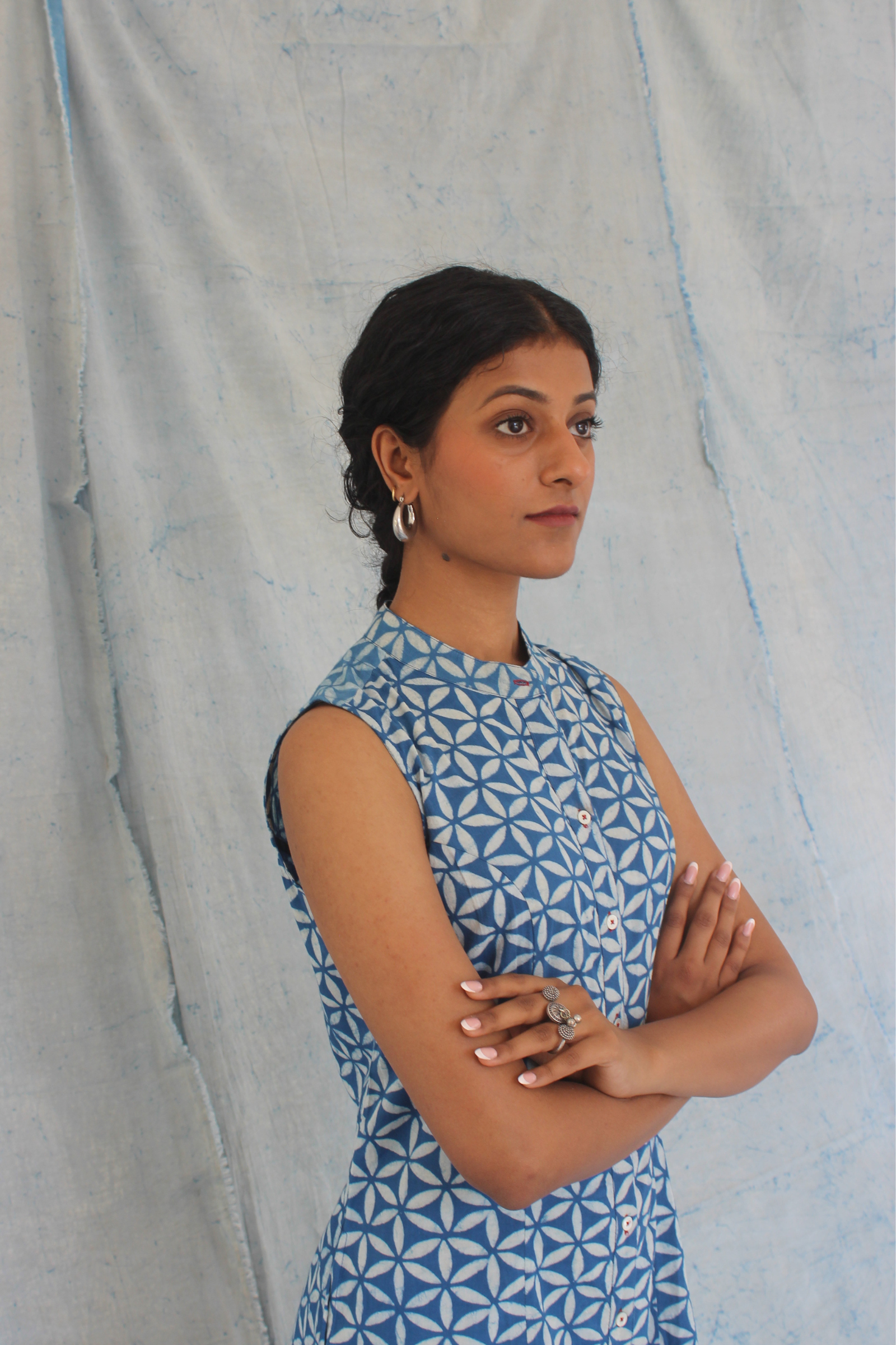Make a statement with the Bloom Panel Dress, crafted from breathable cotton in a rich indigo hue. Adorned with a mesmerizing hand-blocked bloom pattern, this sleeveless, button-down dress exudes effortless elegance. The flowing silhouette and structured collar make it a perfect blend of tradition and contemporary charm, ideal for both casual days and refined gatherings.