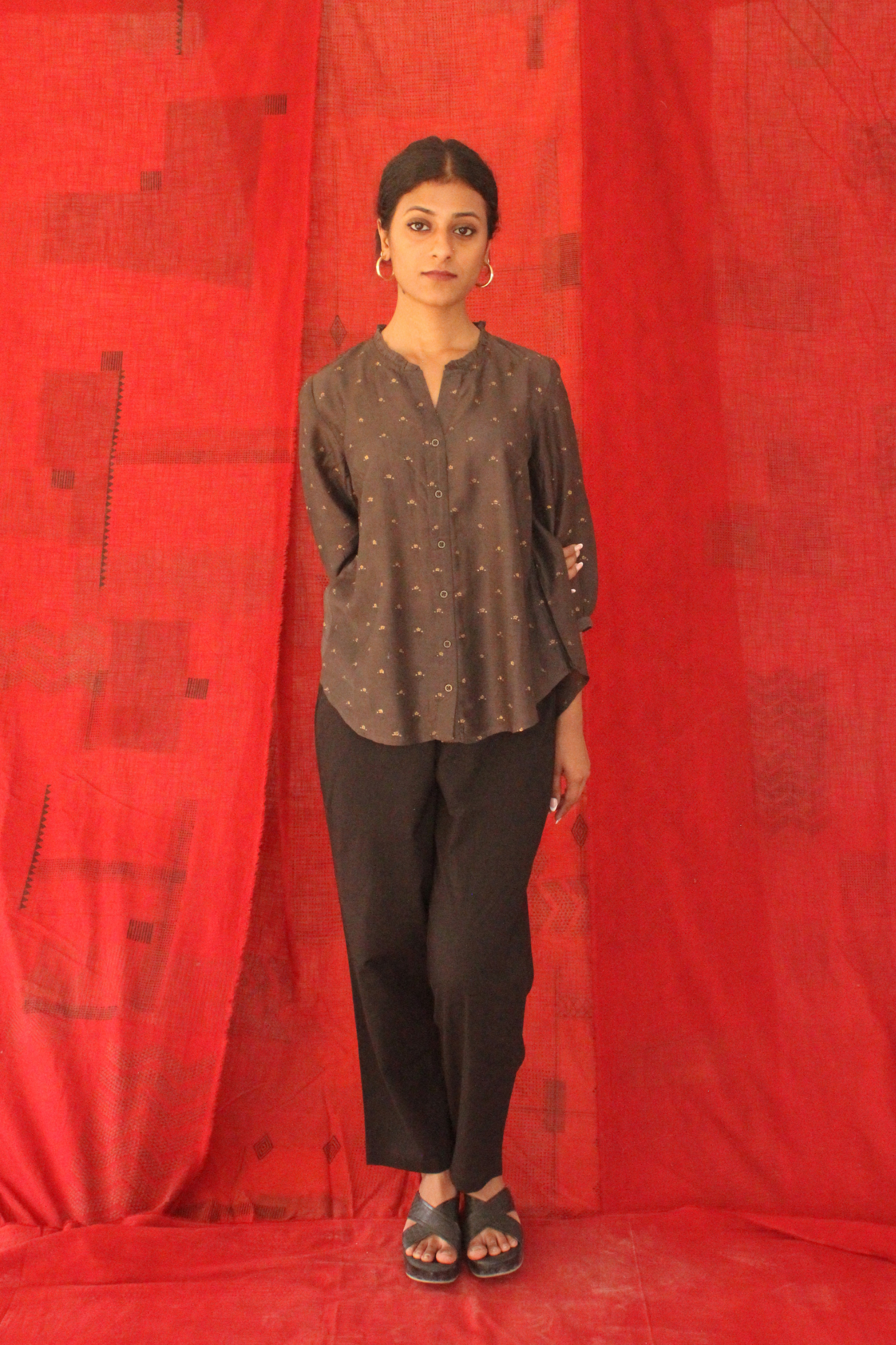 The Brown Rati Butti Shirt in modal silk exudes understated elegance with its soft drape and delicate golden butti motifs. The relaxed fit, button-down front, and subtle mandarin collar make it a versatile addition to any wardrobe—perfect for both workwear and casual outings. The lightweight and breathable fabric ensures comfort while maintaining a polished, sophisticated look.