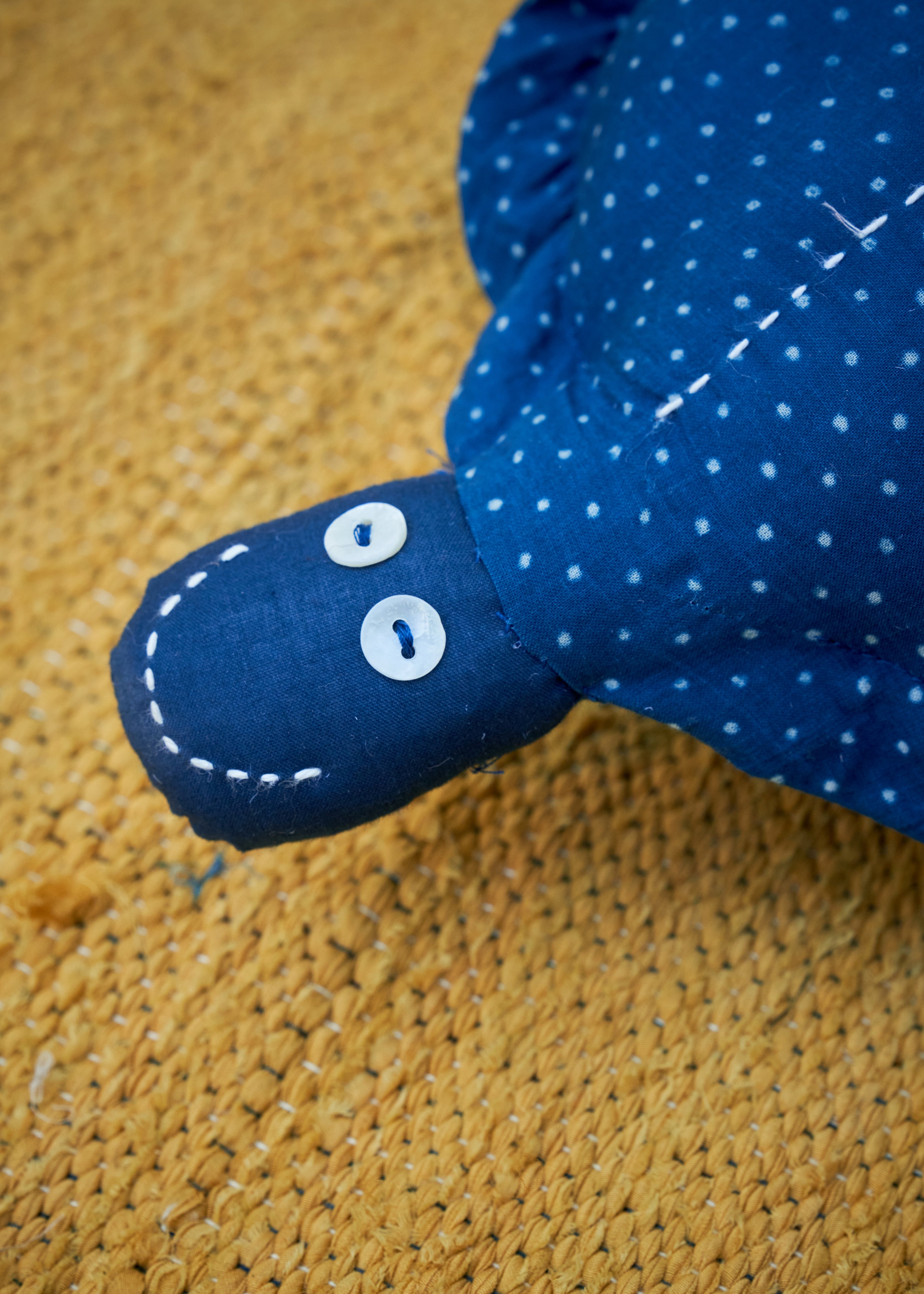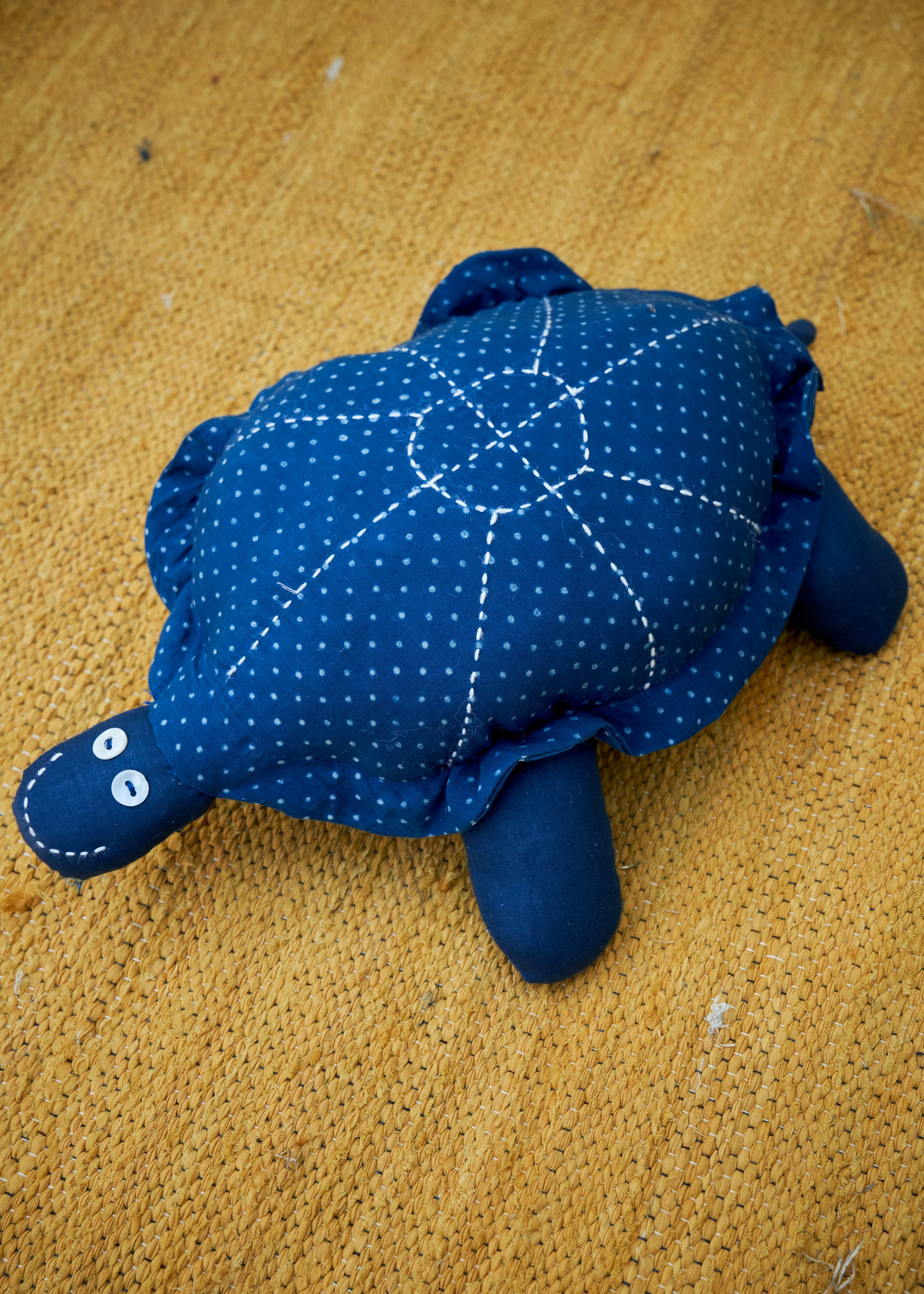 Crafted from indigo-dyed cotton, this adorable tortoise plushie blends traditional hand-stitched detailing with soft, eco-friendly fabric. Its intricate design and block-printed patterns make it a perfect collectible for kids and home decor enthusiasts alike.